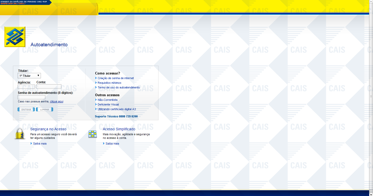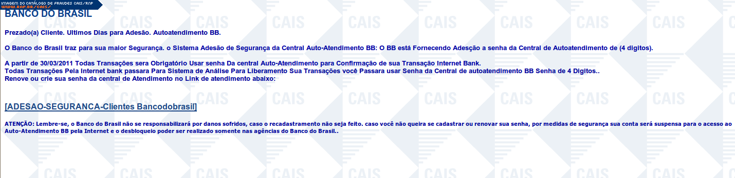 | comentário | Comunicado falso do Banco do Brasil informando que a partir de 30/03/2011 será obrigatório o uso da senha da central de auto-atendimento em todas as transaçãoes. A fraude contém um link para a criação da senha. O link leva a uma página falsa destinada a roubar... (leia mais) | |
