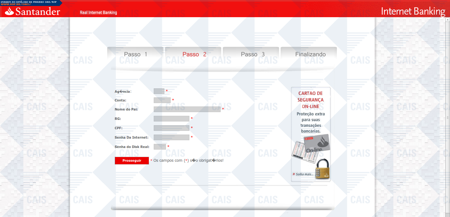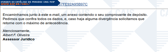Esta página tem função informativa e educativa. Exibe uma coleção de imagens de phishing scam (fraudes eletrônicas) ou malware (código malicioso) veiculados por meio de spam (e-mail não-solicitado). Trata-se de conteúdo exemplificativo, não exaustivo, uma vez que não é possível contemplar todos os casos de fraudes existentes. Assim, caso você tenha conhecimento de um exemplar que não esteja aqui presente, isto não significa que não seja válido ou real. Inclusive incentivamos que você o envie para análise do CAIS para que, se for o caso, passe a integrar o nosso acervo.