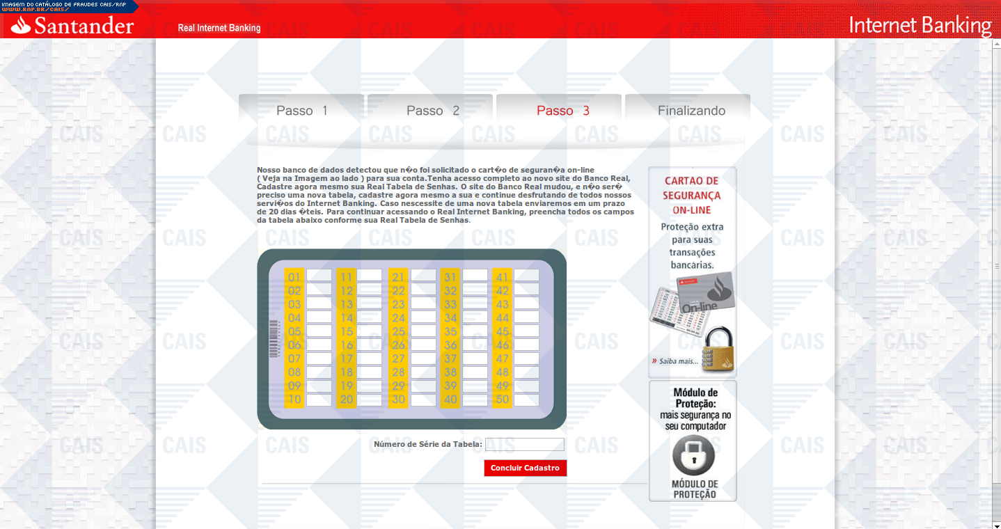 | comentário | Fraude que usa o nome do Grupo Santander para informar que a tabela de senhas da vítima expirou. A mensagem pede que a vítima realize o recadastramento com urgência. O link contido na mensagem leva a uma página falsa destinada a coletar dados da conta bancária... (leia mais) | |