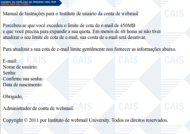| comentário | Mensagem falsa informando que a cota de email da vítima foi ultrapassada. A fraude alicia o usuário a responder a mensagem informando seu email e senha. | |