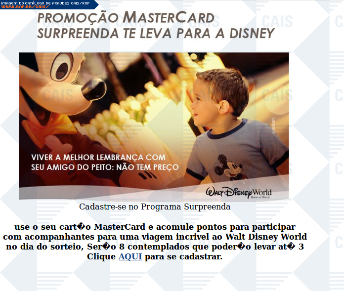 | comentário | Mensagem falsa em nome da Mastercard anunciando uma promoção em que a vítima concorre a viagens para a Disney. O link para o cadastro na promoção leva a uma página falsa destinada a roubar dados sobre o cartão de crédito da vítima. | |