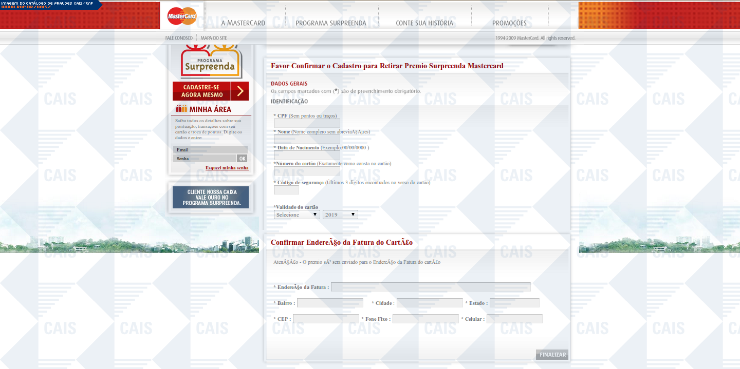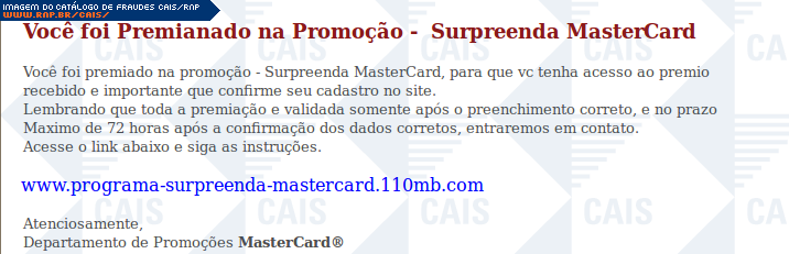 | comentário | Mensagem falsa em nome da empresa Mastercard informando que a vítima foi premiada na promoção surpreenda. A mensagem informa que para receber o prêmio, a vítima deve confirmar seu cadastro no site da promoção. O link contido na mensagem leva a uma página... (leia mais) | |