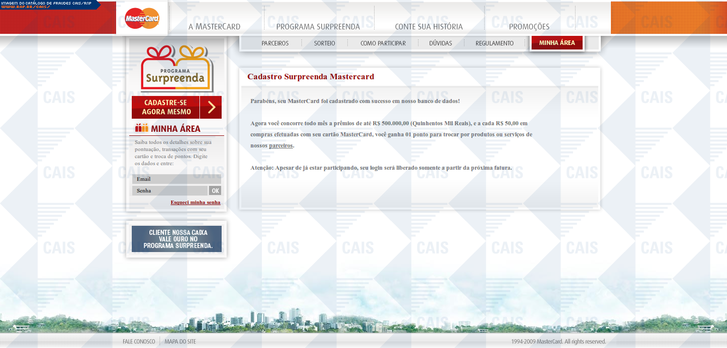 | assunto | Você foi Premianado na Promoção - Surpreenda MasterCard | |