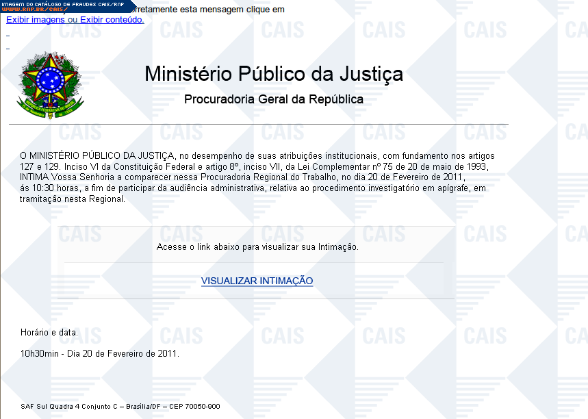 | comentário | Fraude em que o Ministério Público da Justiça estaria intimando a vítima a participar de uma audiência. O link para visualizar a suposta intimação leva ao malware Gen:Trojan.Heur.DP.zGW@aWZeMWe (BitDefender). | |