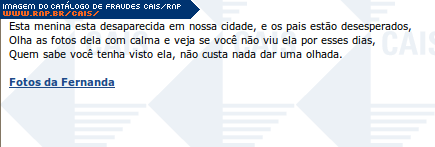| comentário | Mensagem que contém um link para as supostas fotos de uma menina desaparecida. O link contido na mensagem leva a conteúdo malicioso que já havia sido removido no momento da análise. | |