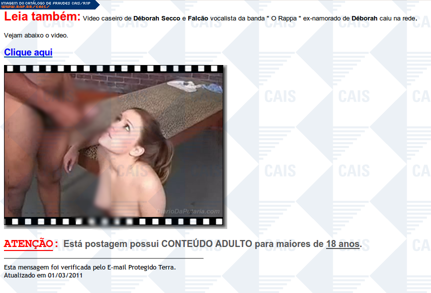 | comentário | Mensagem falsa contendo suposto vídeo de sexo da atriz Deborah Secco com o cantor Falcão. A mensagem contém um link que leva a conteúdo malicioso que estava indisponível no momento da análise. | |