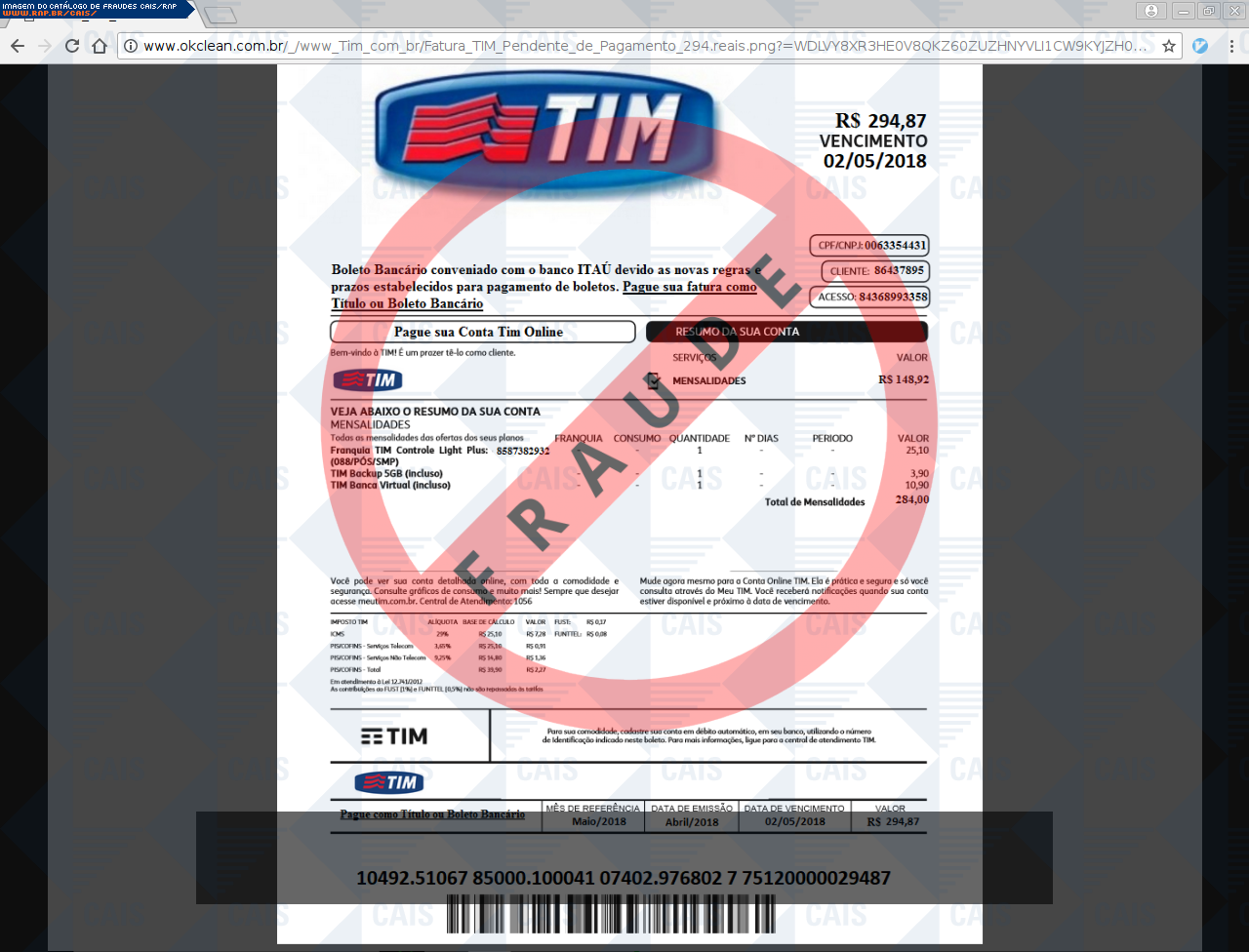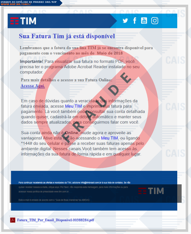 Esta página tem função informativa e educativa. Exibe uma coleção de imagens de phishing scam (fraudes eletrônicas) ou malware (código malicioso) veiculados por meio de spam (e-mail não-solicitado). Trata-se de conteúdo exemplificativo, não exaustivo, uma vez que não é possível contemplar todos os casos de fraudes existentes. Assim, caso você tenha conhecimento de um exemplar que não esteja aqui presente, isto não significa que não seja válido ou real. Inclusive incentivamos que você o envie para análise do CAIS para que, se for o caso, passe a integrar o nosso acervo.