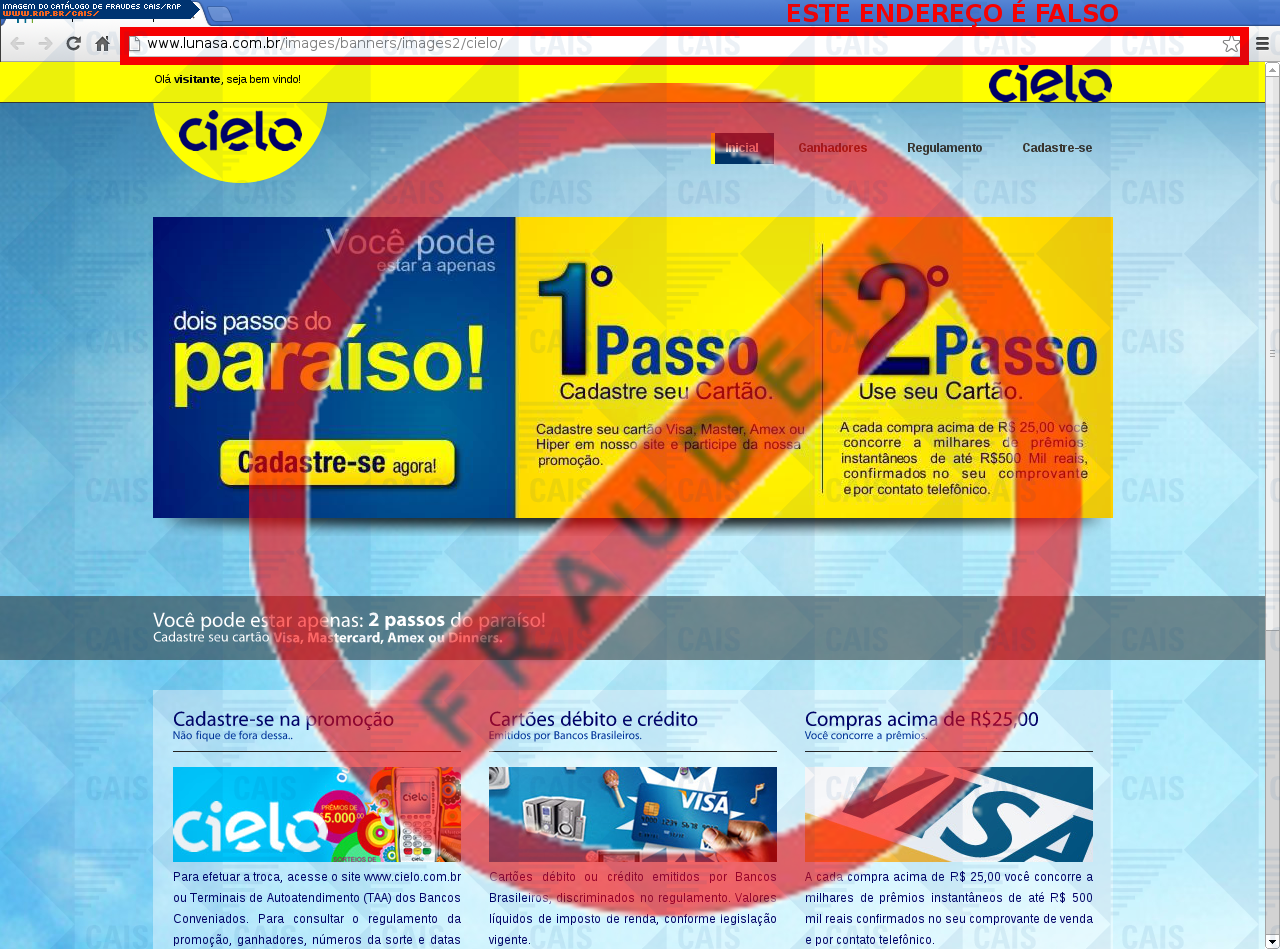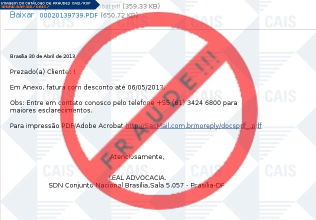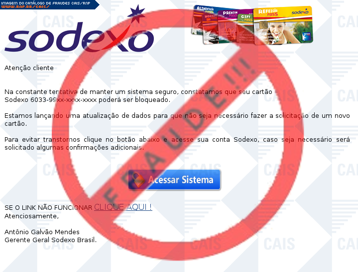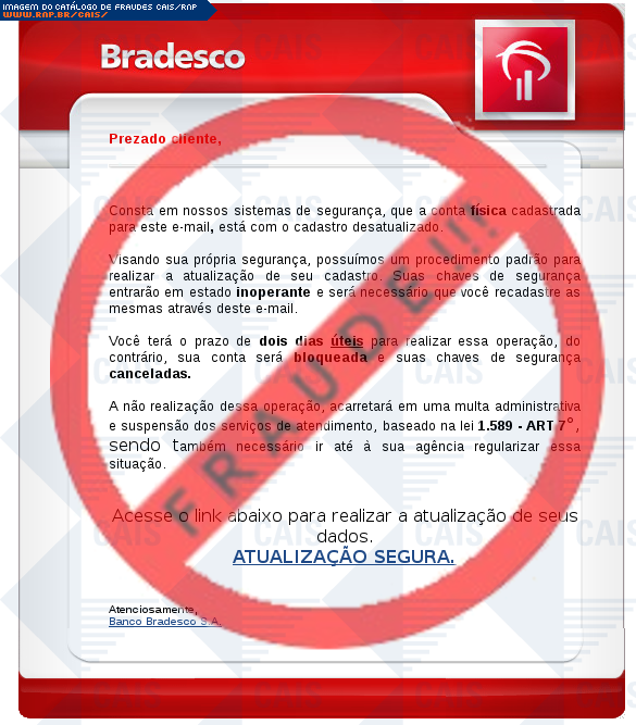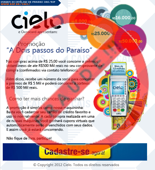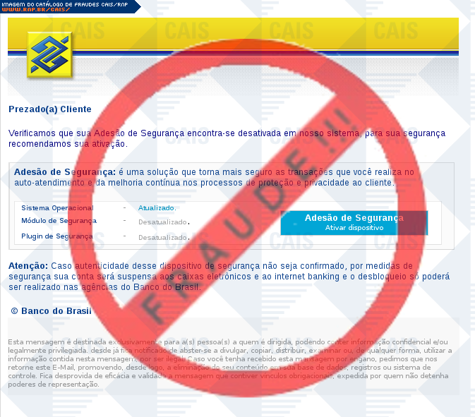 Esta página tem função informativa e educativa. Exibe uma coleção de imagens de phishing scam (fraudes eletrônicas) ou malware (código malicioso) veiculados por meio de spam (e-mail não-solicitado). Trata-se de conteúdo exemplificativo, não exaustivo, uma vez que não é possível contemplar todos os casos de fraudes existentes. Assim, caso você tenha conhecimento de um exemplar que não esteja aqui presente, isto não significa que não seja válido ou real. Inclusive incentivamos que você o envie para análise do CAIS para que, se for o caso, passe a integrar o nosso acervo.
