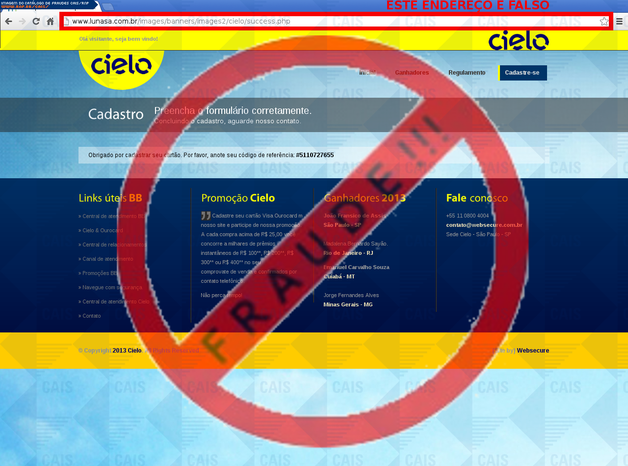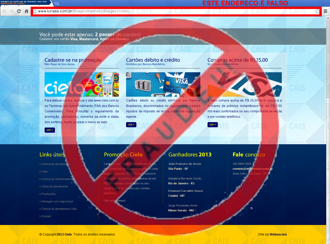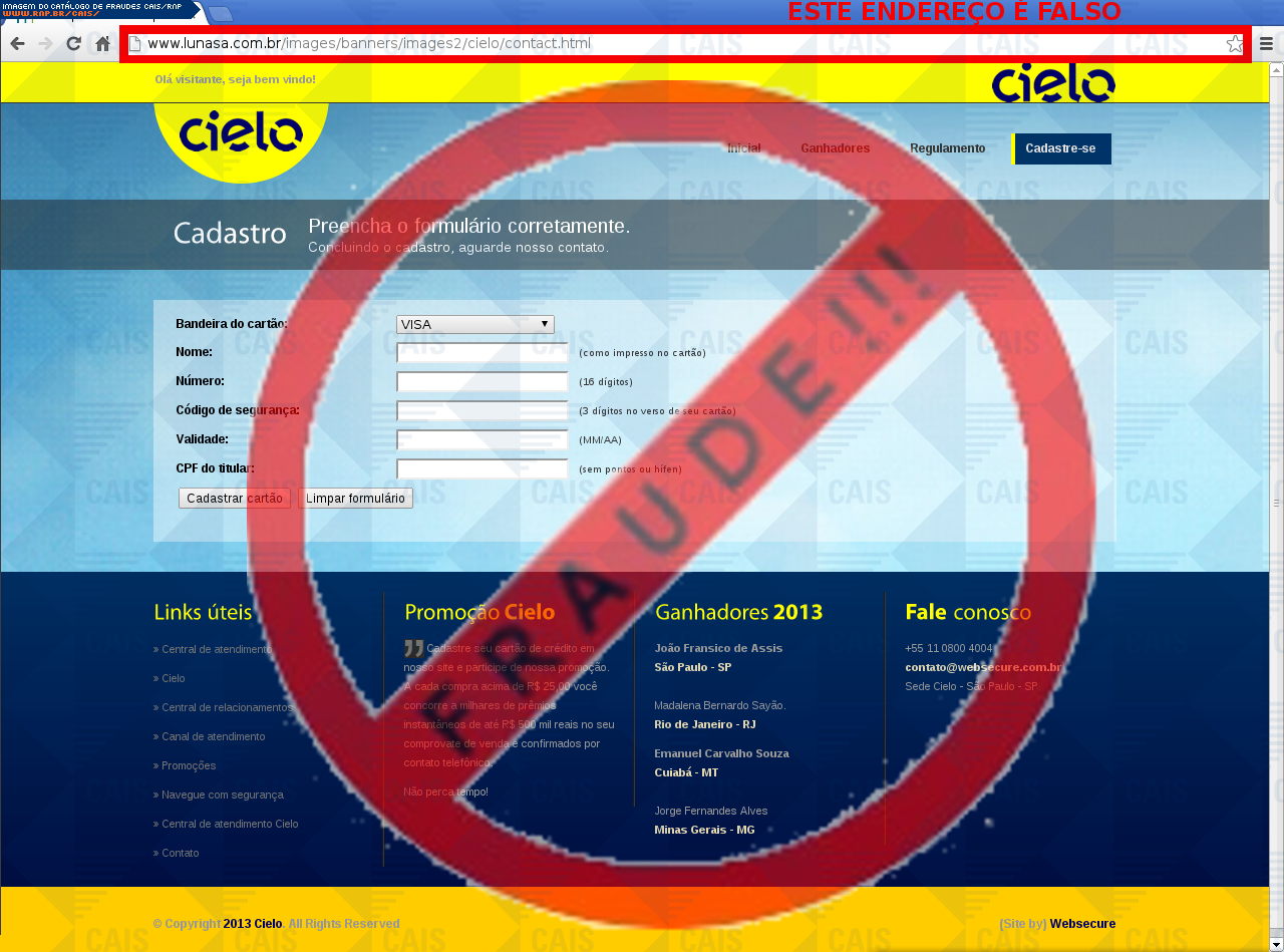 Esta página tem função informativa e educativa. Exibe uma coleção de imagens de phishing scam (fraudes eletrônicas) ou malware (código malicioso) veiculados por meio de spam (e-mail não-solicitado). Trata-se de conteúdo exemplificativo, não exaustivo, uma vez que não é possível contemplar todos os casos de fraudes existentes. Assim, caso você tenha conhecimento de um exemplar que não esteja aqui presente, isto não significa que não seja válido ou real. Inclusive incentivamos que você o envie para análise do CAIS para que, se for o caso, passe a integrar o nosso acervo.