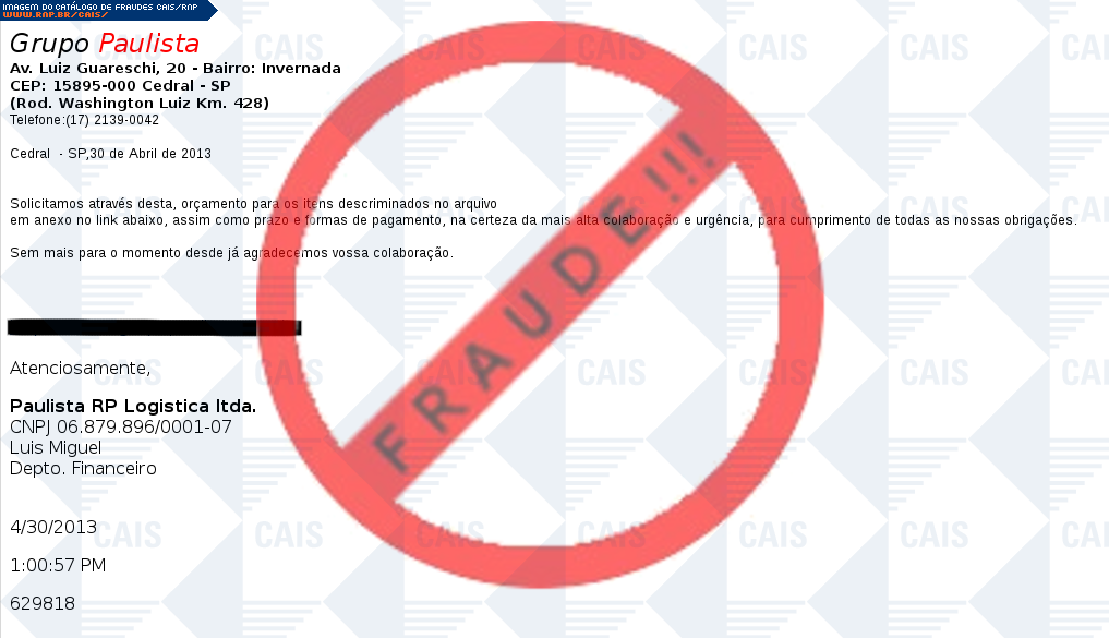 Com a disponibilização pública deste serviço, não é intenção do Centro de Atendimento a Incidentes de Segurança (CAIS) da Rede Nacional de Ensino e Pesquisa (RNP) violar direitos autorais sobre marcas registradas ou logotipos de empresas que porventura constem das amostras. O objetivo é tão somente alertar os usuários sobre as espécies de golpes que se utilizam de tais propriedades intelectuais ou industriais de forma criminosa.