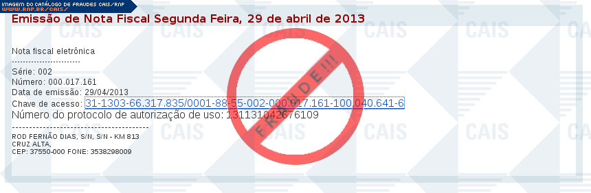 | tipo | FRAUDE - Nota Fiscal Eletrônica | ID: 20206 |
