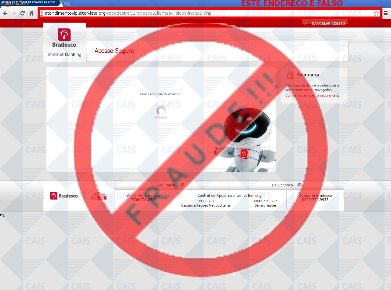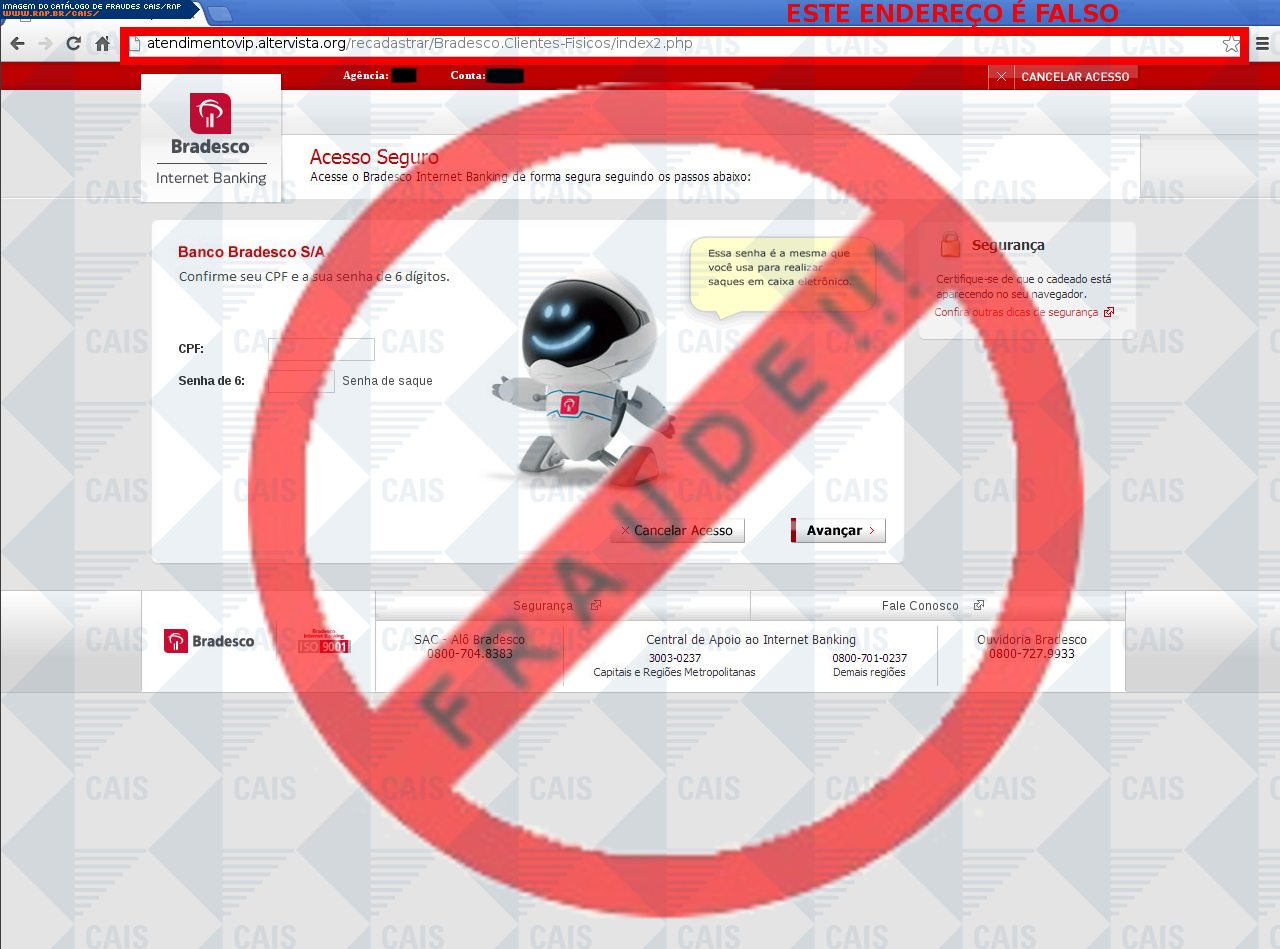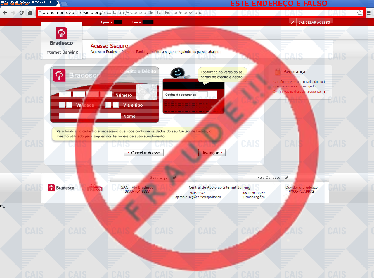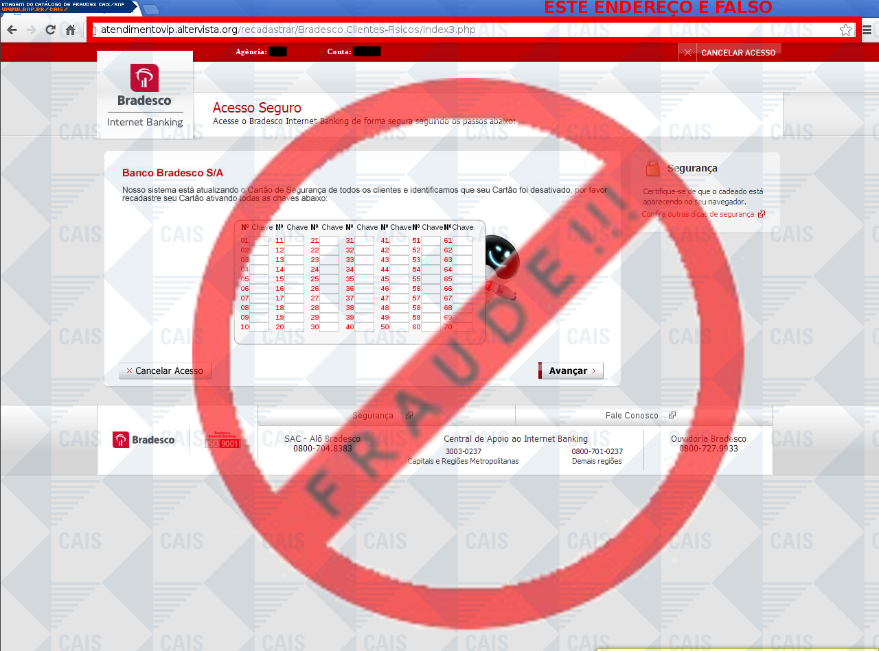 | comentário | Phishing: Nessa fraude o usuário recebe uma mensagem como sendo do banco, porém trata-se de uma tentativa de phishing usando uma pagina falsa na tentativa de adquirir dados sensiveis do usuário. | |