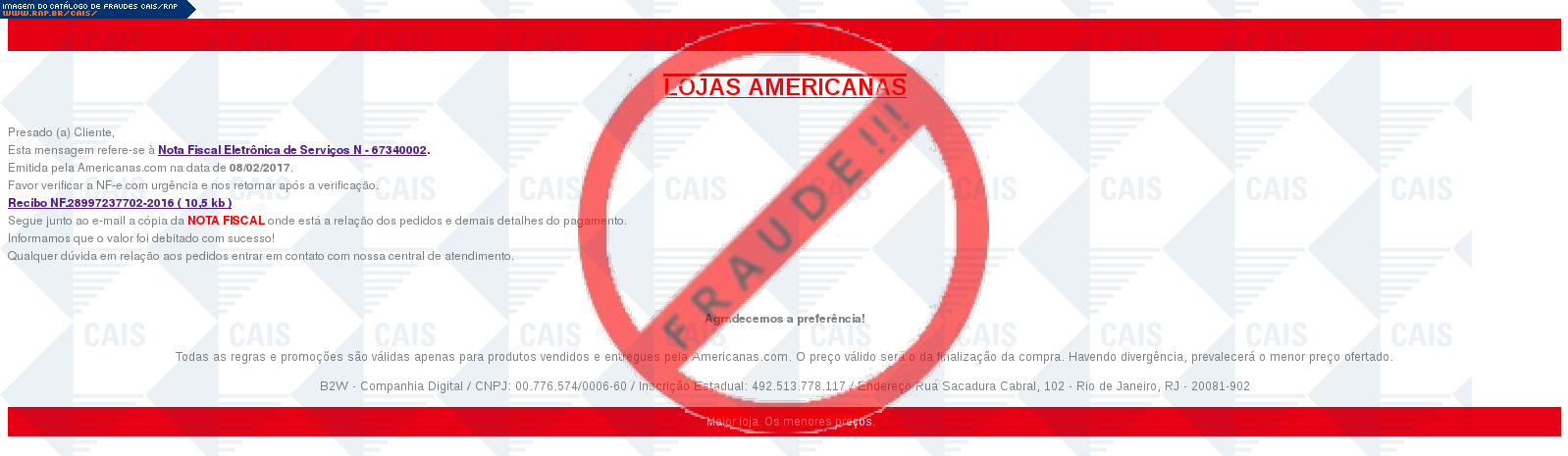 Esta página tem função informativa e educativa. Exibe uma coleção de imagens de phishing scam (fraudes eletrônicas) ou malware (código malicioso) veiculados por meio de spam (e-mail não-solicitado). Trata-se de conteúdo exemplificativo, não exaustivo, uma vez que não é possível contemplar todos os casos de fraudes existentes. Assim, caso você tenha conhecimento de um exemplar que não esteja aqui presente, isto não significa que não seja válido ou real. Inclusive incentivamos que você o envie para análise do CAIS para que, se for o caso, passe a integrar o nosso acervo.