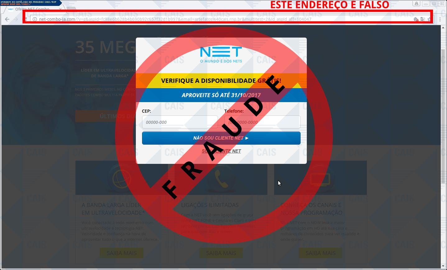 Esta página tem função informativa e educativa. Exibe uma coleção de imagens de phishing scam (fraudes eletrônicas) ou malware (código malicioso) veiculados por meio de spam (e-mail não-solicitado). Trata-se de conteúdo exemplificativo, não exaustivo, uma vez que não é possível contemplar todos os casos de fraudes existentes. Assim, caso você tenha conhecimento de um exemplar que não esteja aqui presente, isto não significa que não seja válido ou real. Inclusive incentivamos que você o envie para análise do CAIS para que, se for o caso, passe a integrar o nosso acervo.