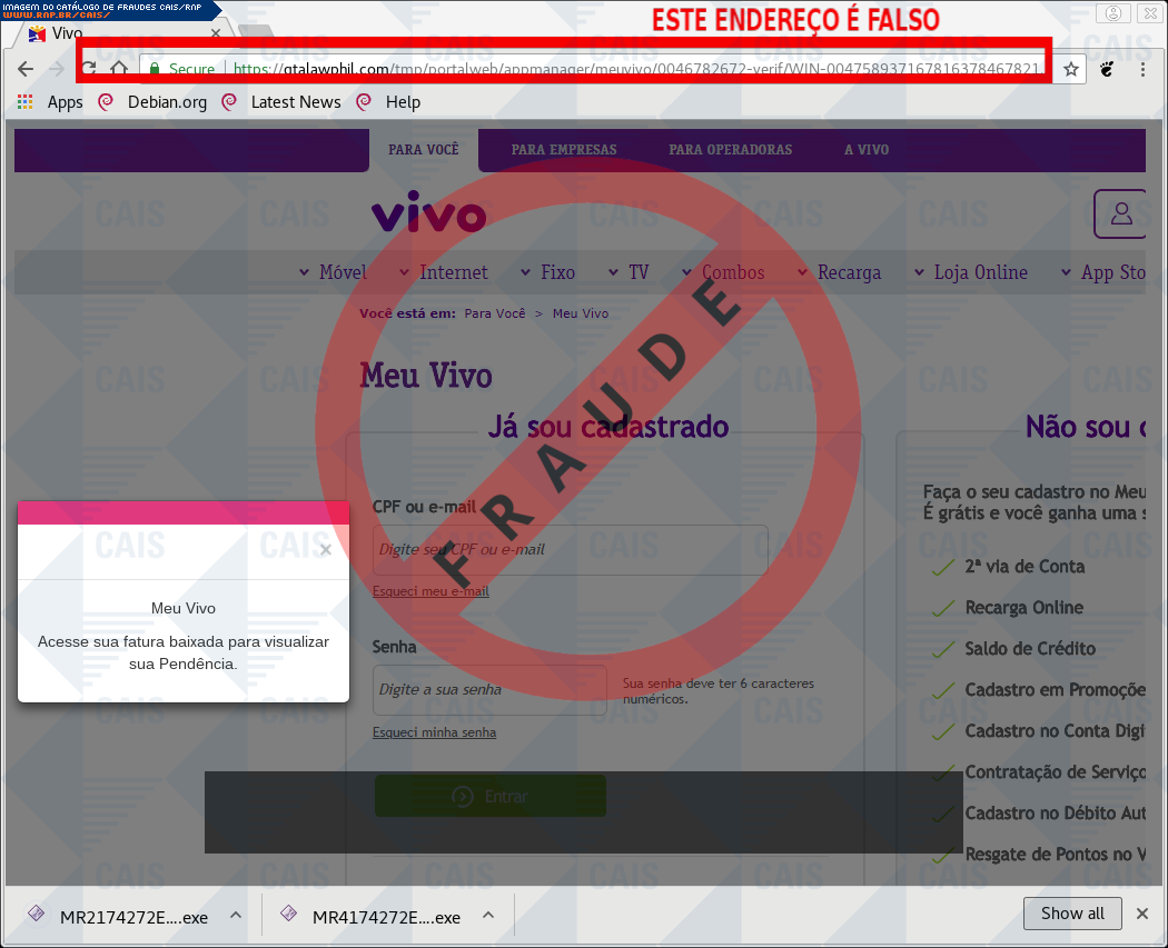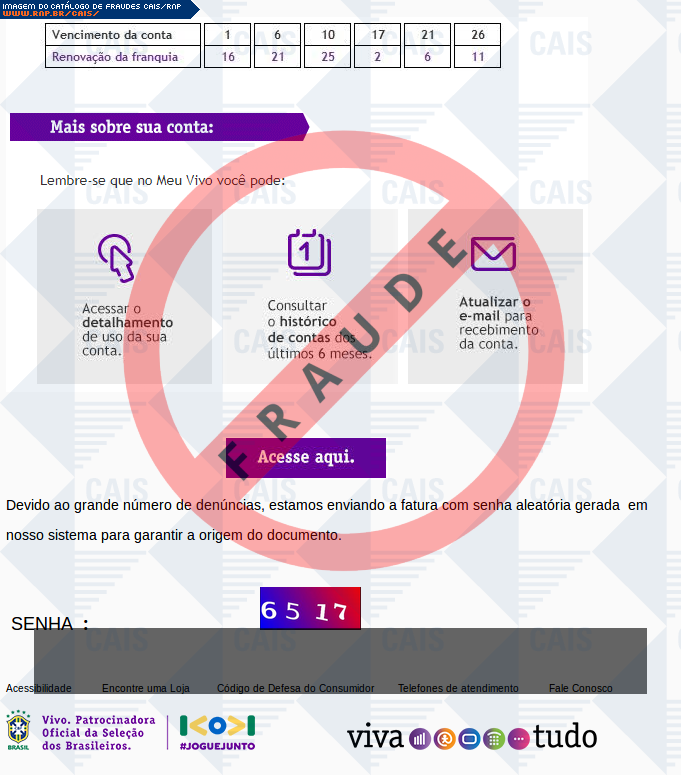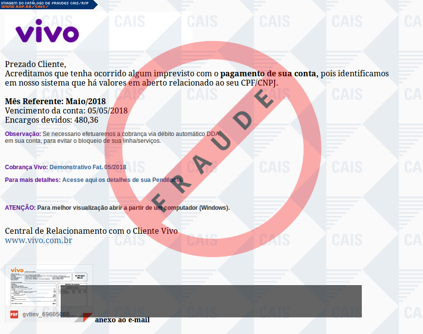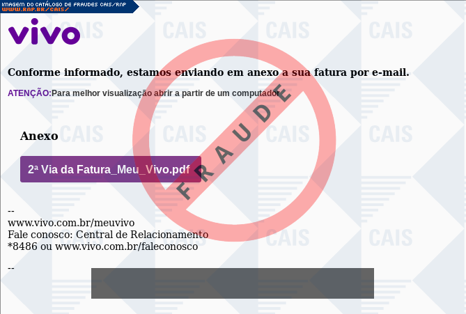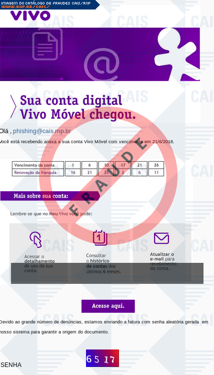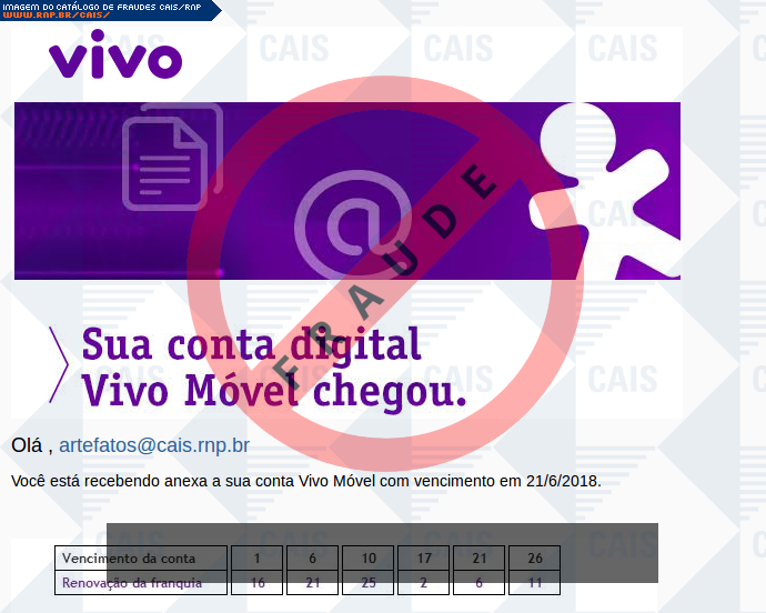 Esta página tem função informativa e educativa. Exibe uma coleção de imagens de phishing scam (fraudes eletrônicas) ou malware (código malicioso) veiculados por meio de spam (e-mail não-solicitado). Trata-se de conteúdo exemplificativo, não exaustivo, uma vez que não é possível contemplar todos os casos de fraudes existentes. Assim, caso você tenha conhecimento de um exemplar que não esteja aqui presente, isto não significa que não seja válido ou real. Inclusive incentivamos que você o envie para análise do CAIS para que, se for o caso, passe a integrar o nosso acervo.