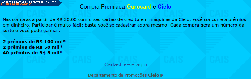 | comentário | A fraude contém um link para o cadastro em uma suposta promoção da Cielo e Ourocard. O link leva a conteúdo malicioso que já havia sido removido. | |