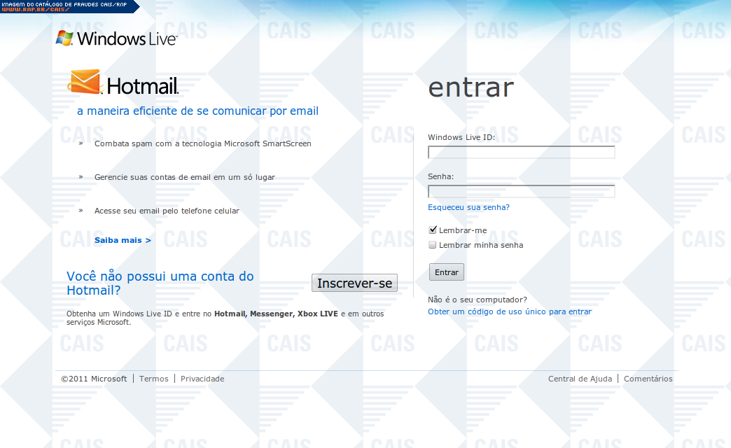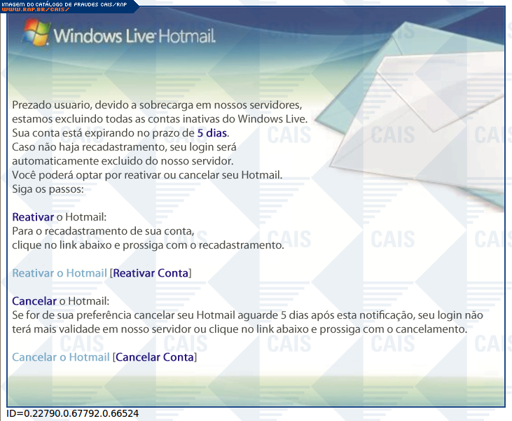 | comentário | A mensagem em nome do Hotmail contém um link para que a vítima reative seu e-mail. O link leva a uma página falsa destinada a roubar a senha da vítima. | |