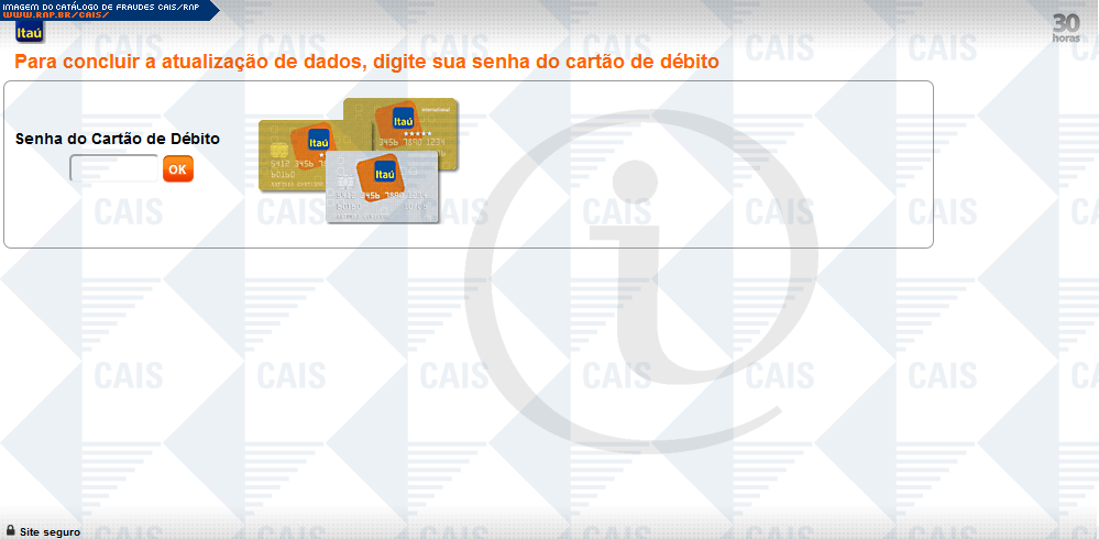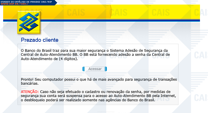 Esta página tem função informativa e educativa. Exibe uma coleção de imagens de phishing scam (fraudes eletrônicas) ou malware (código malicioso) veiculados por meio de spam (e-mail não-solicitado). Trata-se de conteúdo exemplificativo, não exaustivo, uma vez que não é possível contemplar todos os casos de fraudes existentes. Assim, caso você tenha conhecimento de um exemplar que não esteja aqui presente, isto não significa que não seja válido ou real. Inclusive incentivamos que você o envie para análise do CAIS para que, se for o caso, passe a integrar o nosso acervo.