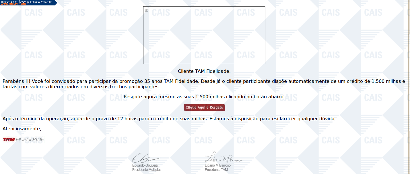 | comentário | A fraude tenta aliciar a vítima a se cadastrar em uma suposta promoção da TAM. O conteúdo malicioso não estava mais disponível no momento da análise. | |
