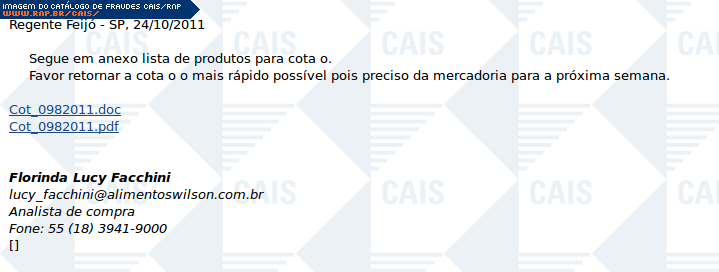 | comentário | A mensagem contém um link para uma suposta lista de produtos para uma cotação de preços. O link leva a conteúdo malicioso que não estava mais disponível. | |