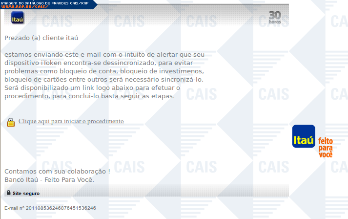 | comentário | A mensagem contém um link para que a vítima realize a suposta sincronização do seu dispositifo iToken. O link leva a um site falso do banco Itaú, destinado a coletar dados da conta bancária da vítima. | |