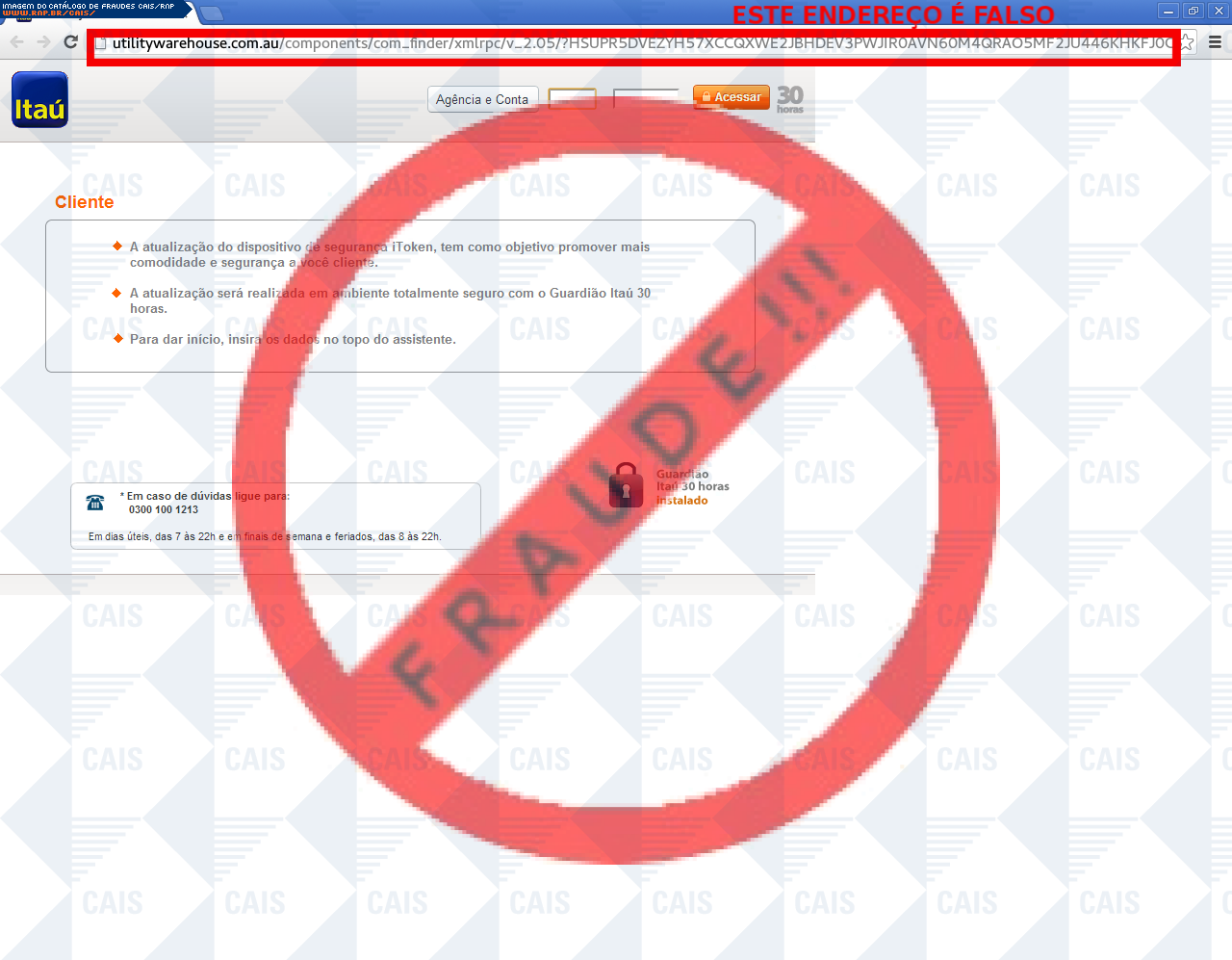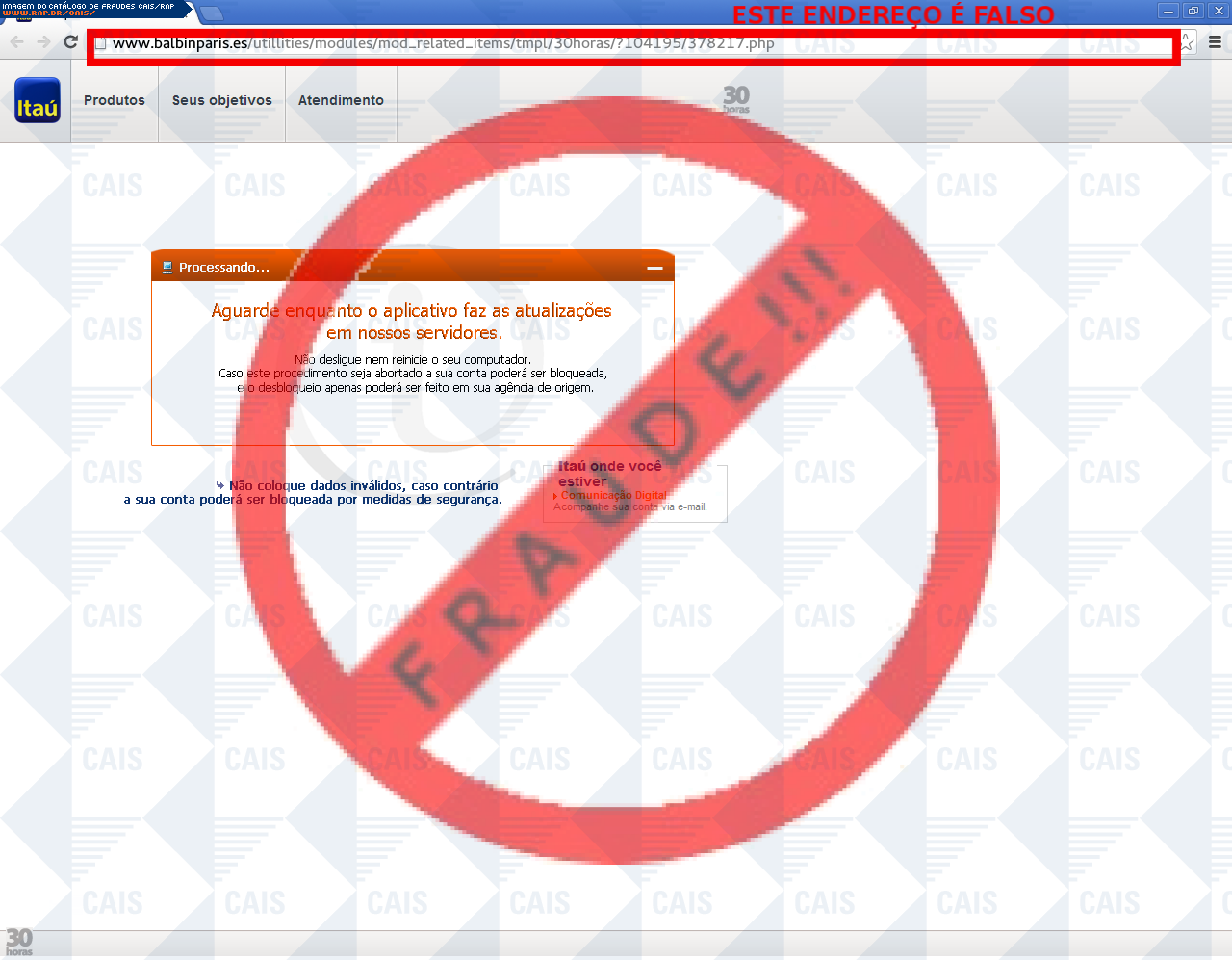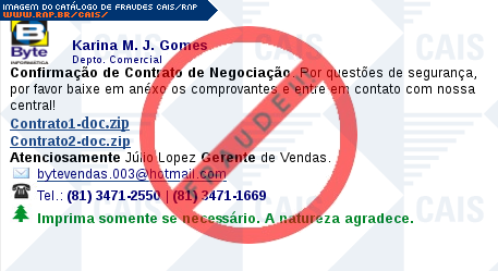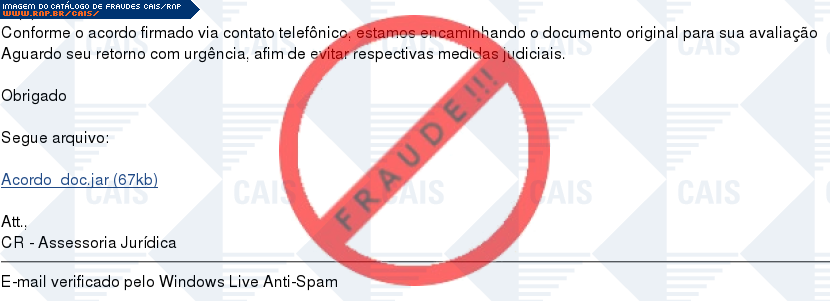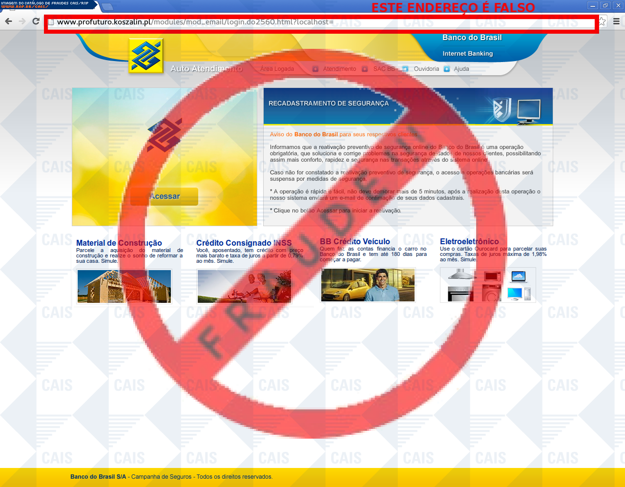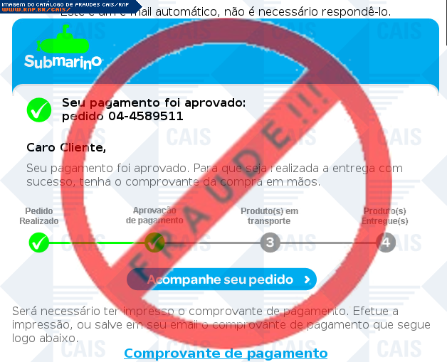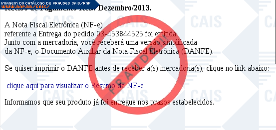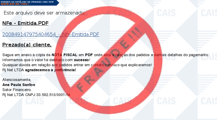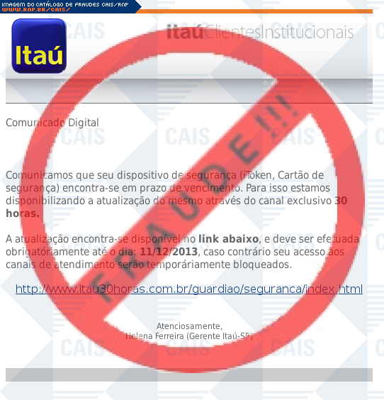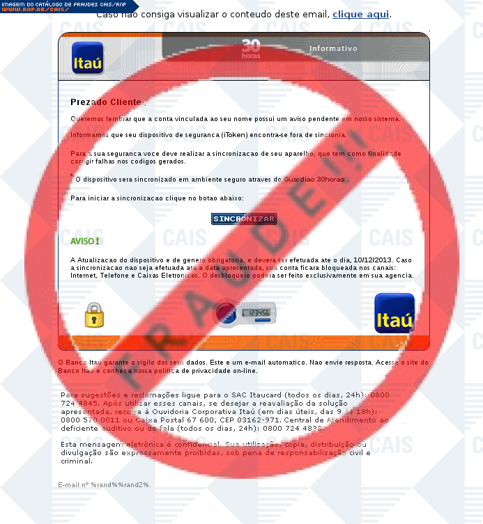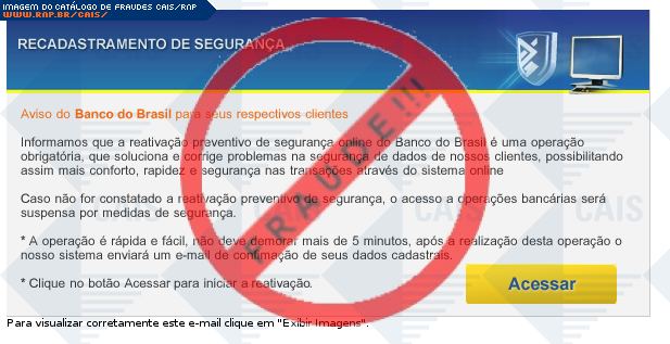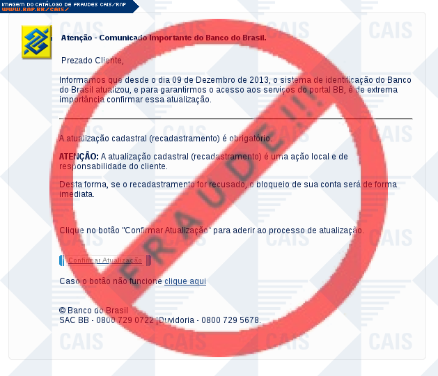 Esta página tem função informativa e educativa. Exibe uma coleção de imagens de phishing scam (fraudes eletrônicas) ou malware (código malicioso) veiculados por meio de spam (e-mail não-solicitado). Trata-se de conteúdo exemplificativo, não exaustivo, uma vez que não é possível contemplar todos os casos de fraudes existentes. Assim, caso você tenha conhecimento de um exemplar que não esteja aqui presente, isto não significa que não seja válido ou real. Inclusive incentivamos que você o envie para análise do CAIS para que, se for o caso, passe a integrar o nosso acervo.
