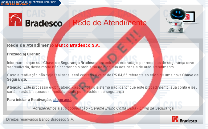 | comentário | A vítima recebe um email fraudulento de um banco, informando que sua chave de segurança encontra-se expirada. O link para a suposta reativação direciona para um site de phishing. | |