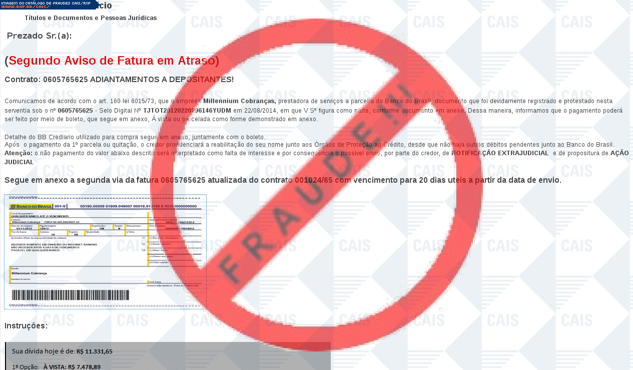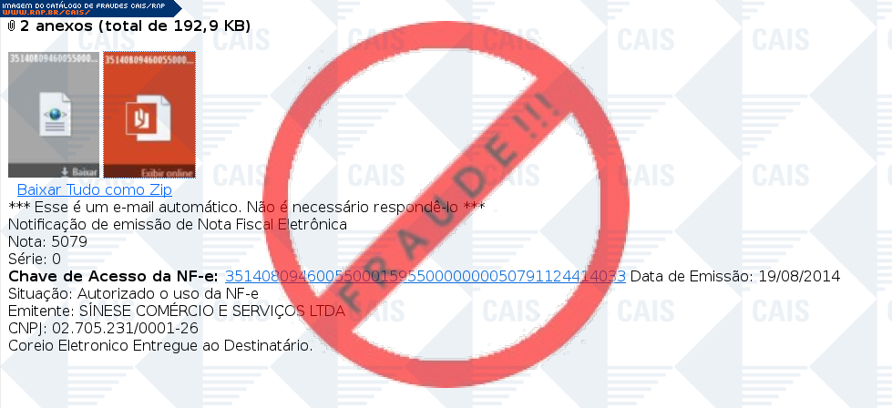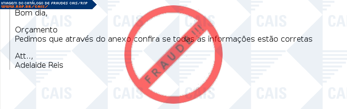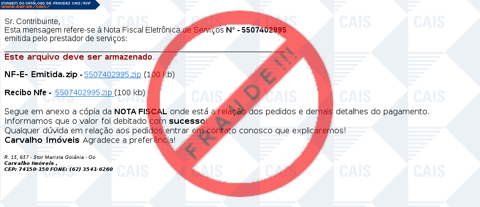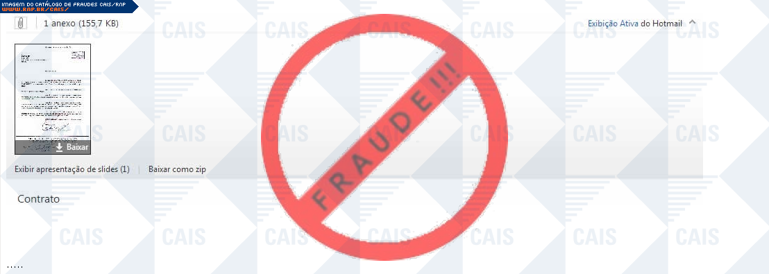 Esta página tem função informativa e educativa. Exibe uma coleção de imagens de phishing scam (fraudes eletrônicas) ou malware (código malicioso) veiculados por meio de spam (e-mail não-solicitado). Trata-se de conteúdo exemplificativo, não exaustivo, uma vez que não é possível contemplar todos os casos de fraudes existentes. Assim, caso você tenha conhecimento de um exemplar que não esteja aqui presente, isto não significa que não seja válido ou real. Inclusive incentivamos que você o envie para análise do CAIS para que, se for o caso, passe a integrar o nosso acervo.