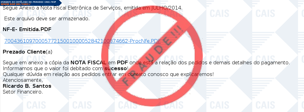 | comentário | A vítima recebe um e-mail contendo uma nota fiscal eletrônica disponível para download no entanto, o arquivo originado é malicioso destinado a roubar informações do usuário com o nome de Trojan.Win32.Banload.Ab. | |