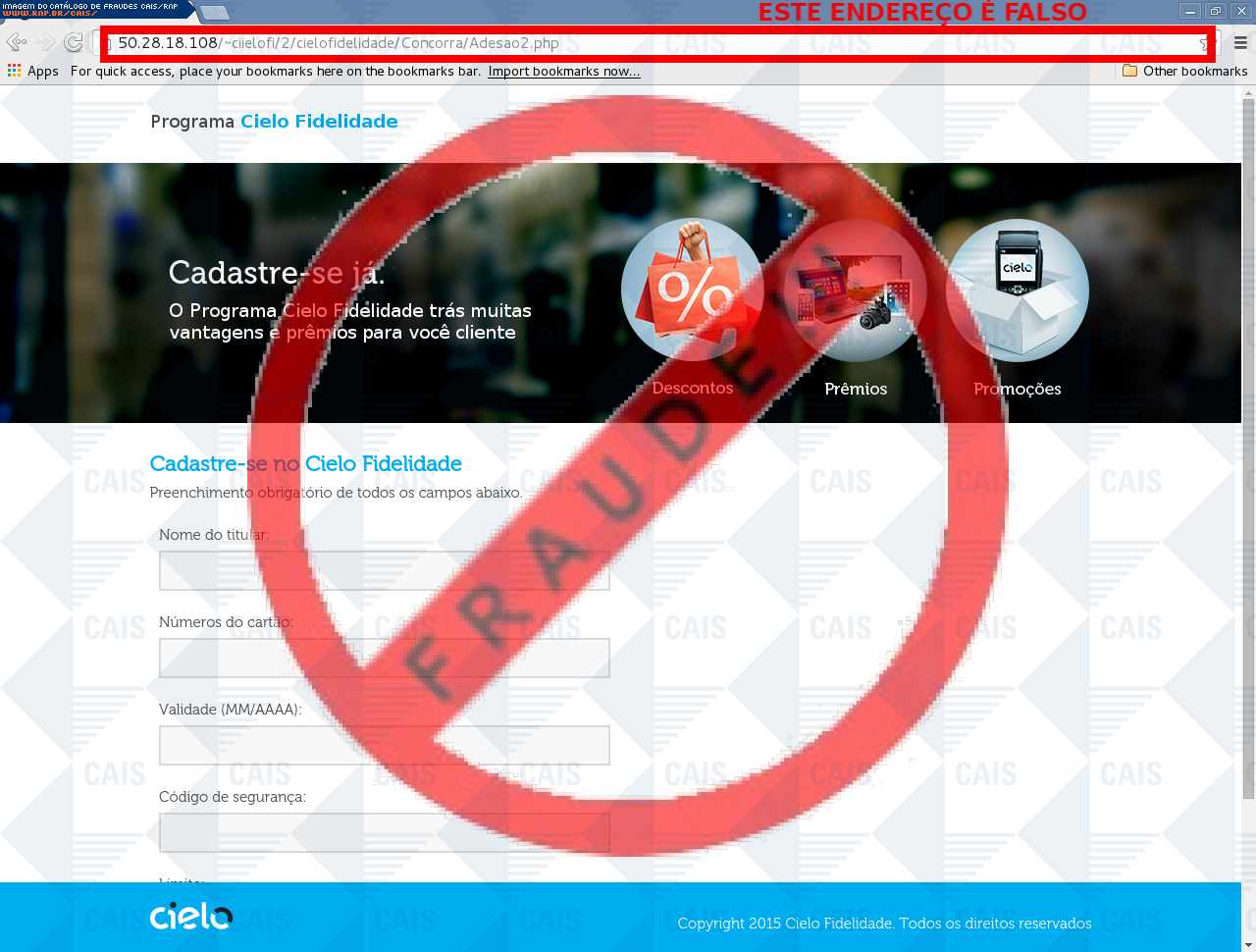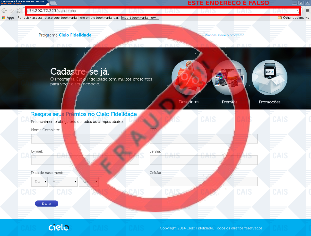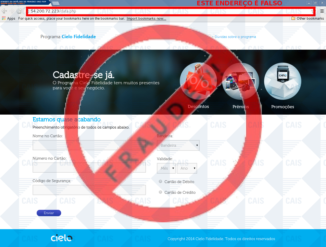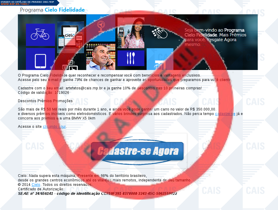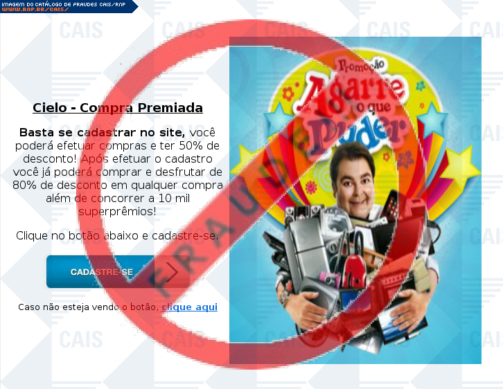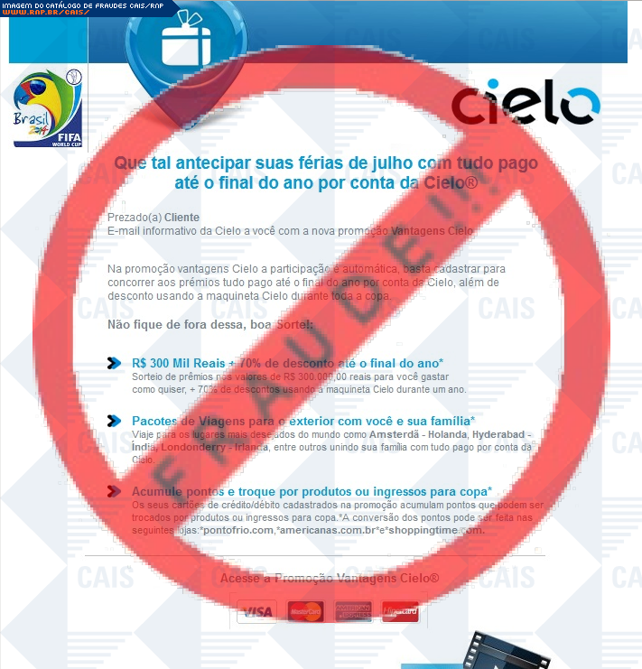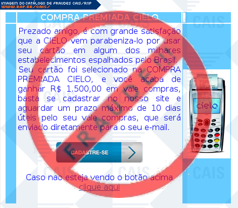 | comentário | A vítima recebe um e-mail informando sobre promoções relacionados a seu cartão Cielo sendo necessário realizar um cadastro, no entanto a página é falsa destinada a roubar os dados do cartão de crédito do usuário. | |