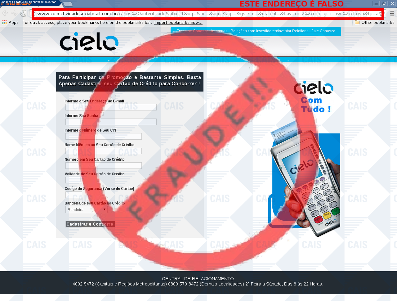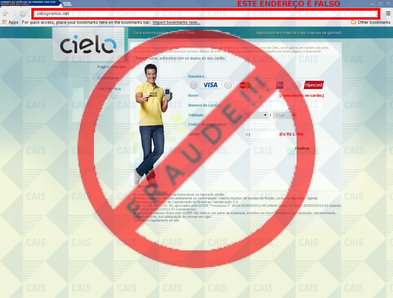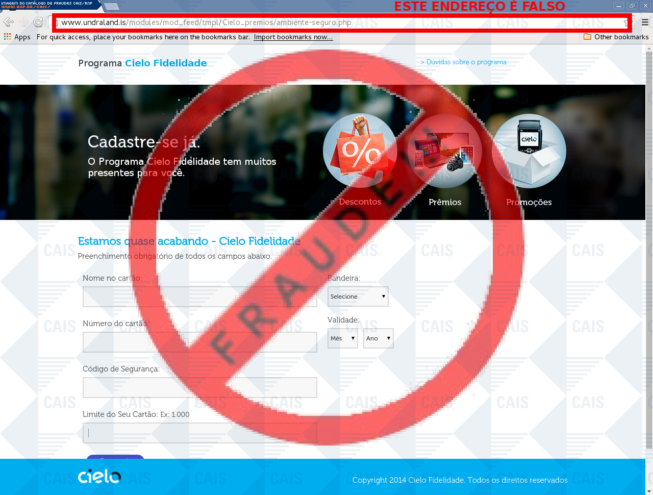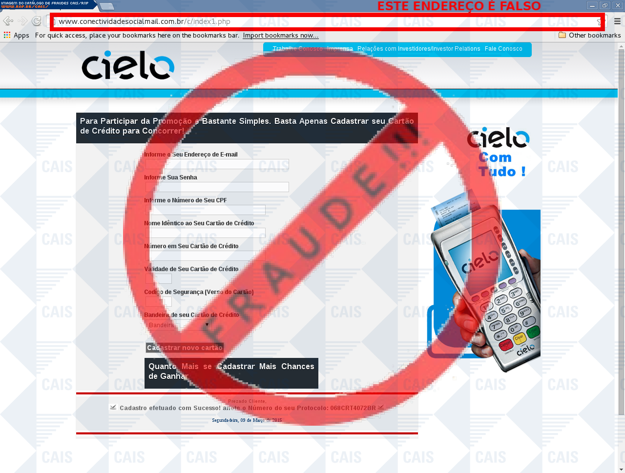 | comentário | A vítima recebe um e-mail informando sobre promoções relacionados a seu cartão Cielo sendo necessário realizar um cadastro, no entanto a página é falsa destinada a roubar os dados do cartão de crédito do usuário. | |