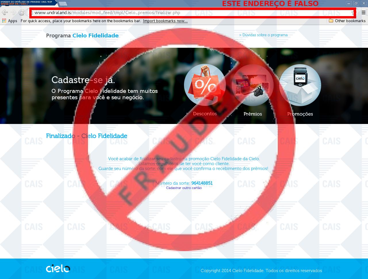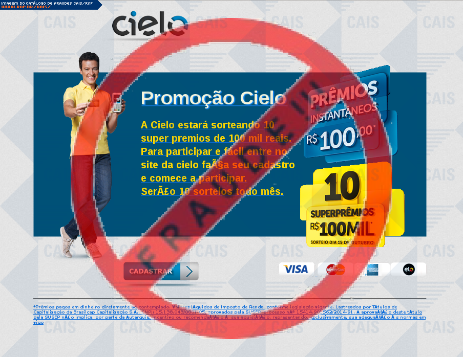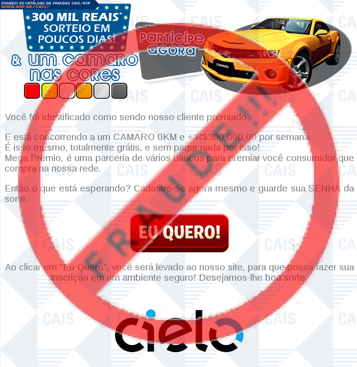 | comentário | A vítima recebe um e-mail informando que foi comtemplado na promoção relacionada a seu cartão Cielo sendo necessário realizar um cadastro para receber o prêmio, no entanto a página é falsa destinada a roubar os dados do usuário. | |