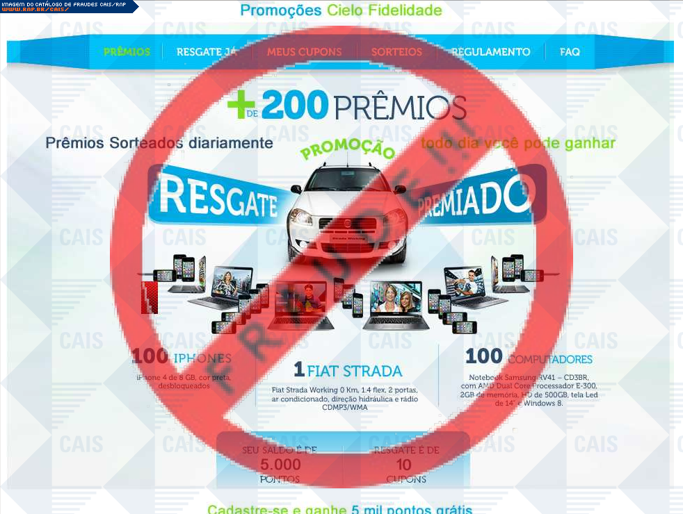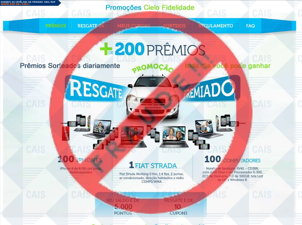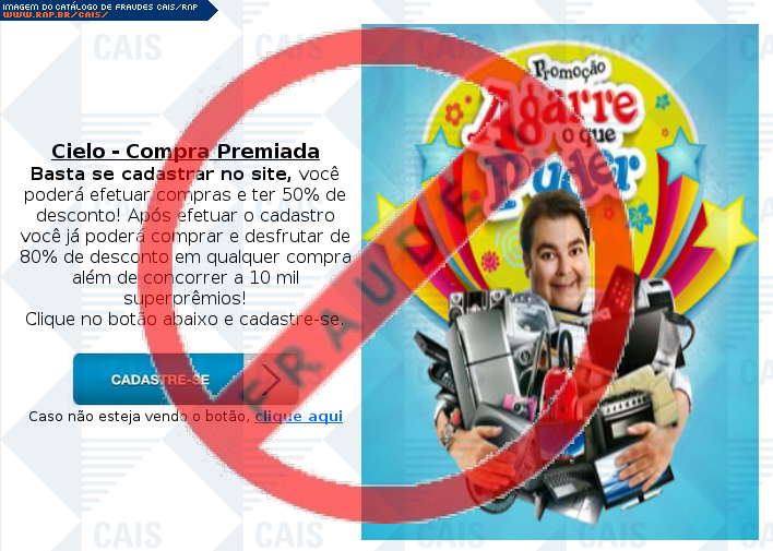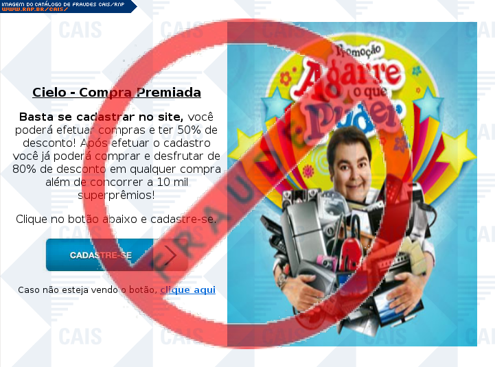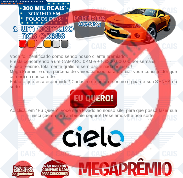 | comentário | A vítima recebe um e-mail informando sobre a promoção Mega Prêmio relacionada a seu cartão Cielo sendo necessário realizar um cadastro, no entanto a página é falsa destinada a roubar os dados do cartão de crédito do usuário. | |