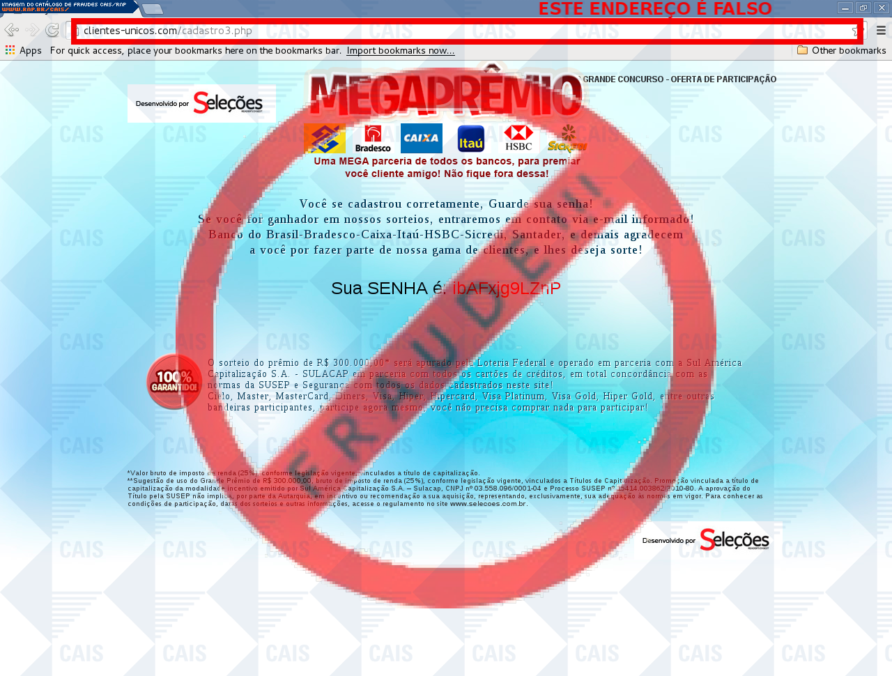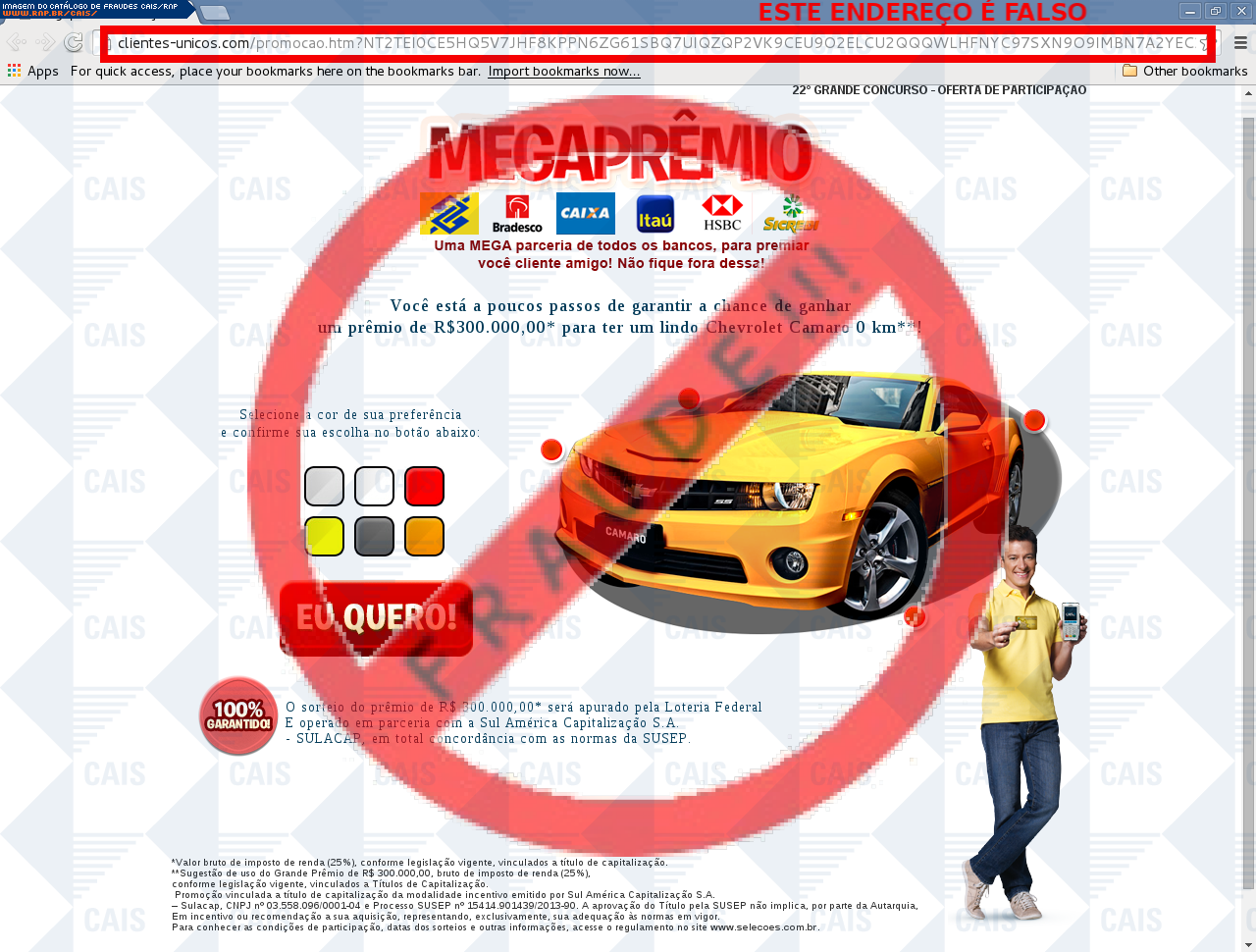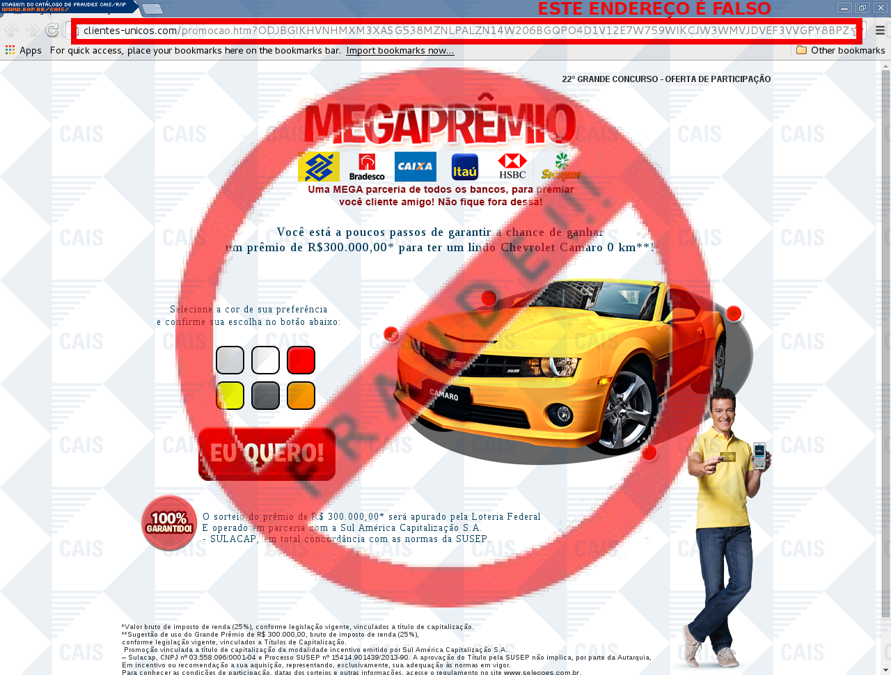 | comentário | A vítima recebe um e-mail informando sobre a promoção Mega Prêmio relacionada a seu cartão Cielo sendo necessário realizar um cadastro, no entanto a página é falsa destinada a roubar os dados do cartão de crédito do usuário. | |