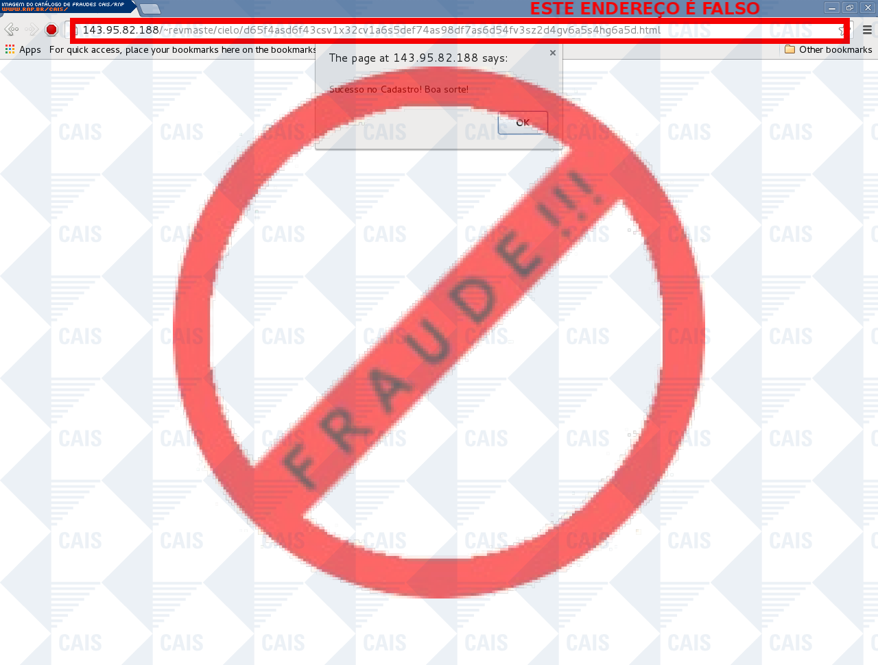 |   |  Fraudes identificadas e divulgadas pelo CAISA partir de 2008, todas as fraudes identificadas pelo CAIS estão sendo ordenadas de acordo com a data de distribuição e disponibilizadas para consulta, com o intuito de conscientizar a comunidade sobre os principais golpes que estão em circulação. Adicionalmente, o CAIS envia alertas de segurança através da lista CAIS Alerta quando uma fraude mostra-se particularmente perigosa aos usuários de computadores. Reporte fraudes: