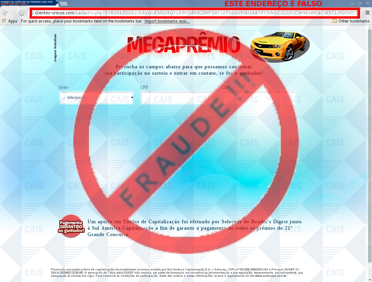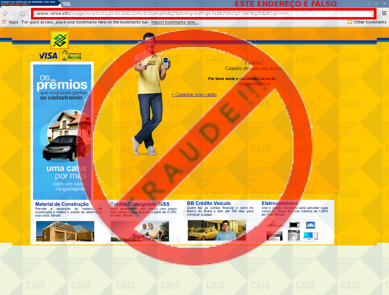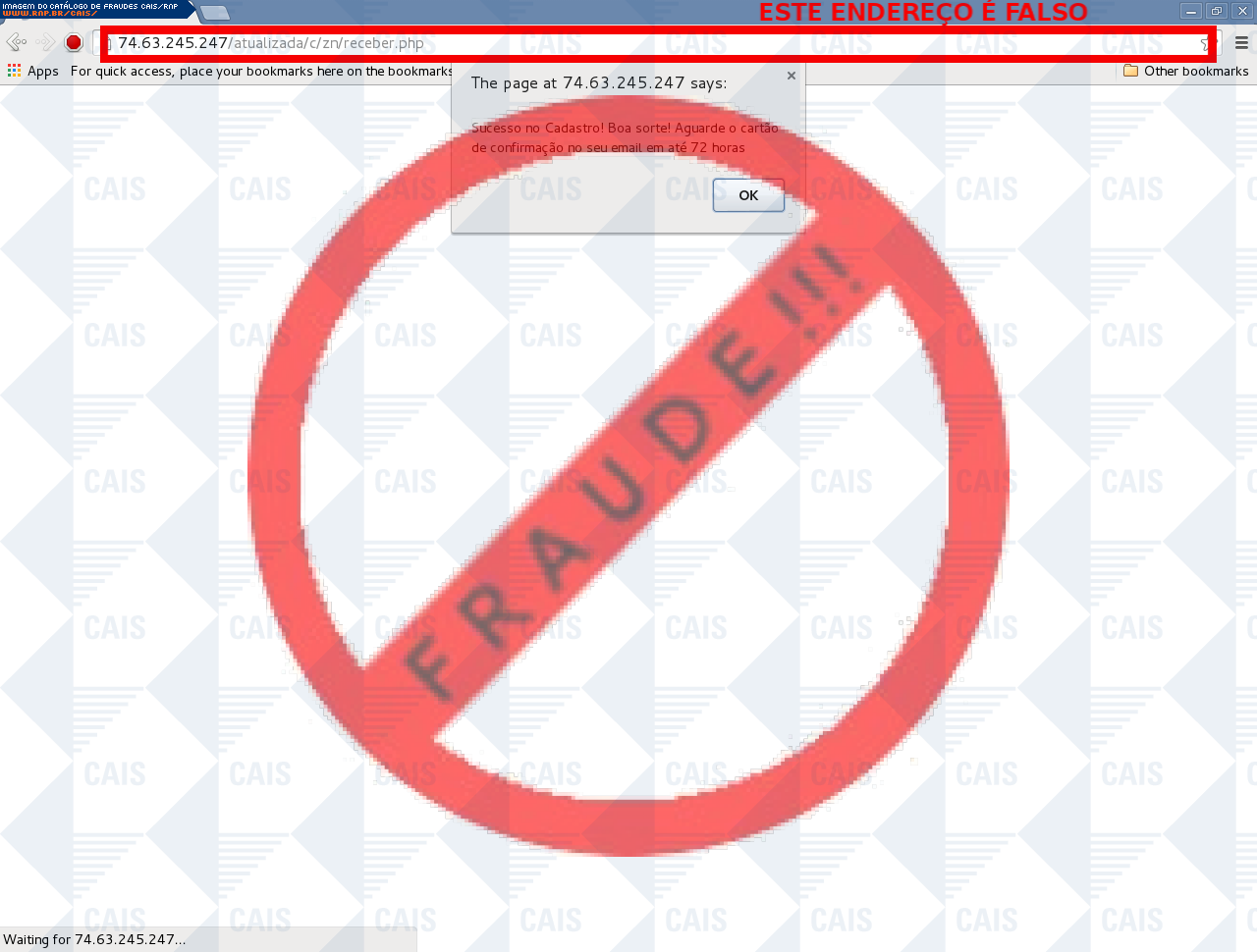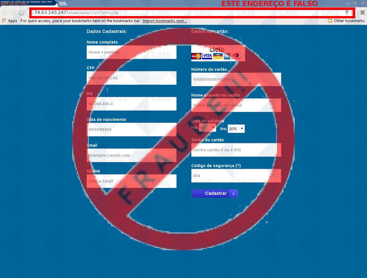 Esta página tem função informativa e educativa. Exibe uma coleção de imagens de phishing scam (fraudes eletrônicas) ou malware (código malicioso) veiculados por meio de spam (e-mail não-solicitado). Trata-se de conteúdo exemplificativo, não exaustivo, uma vez que não é possível contemplar todos os casos de fraudes existentes. Assim, caso você tenha conhecimento de um exemplar que não esteja aqui presente, isto não significa que não seja válido ou real. Inclusive incentivamos que você o envie para análise do CAIS para que, se for o caso, passe a integrar o nosso acervo.