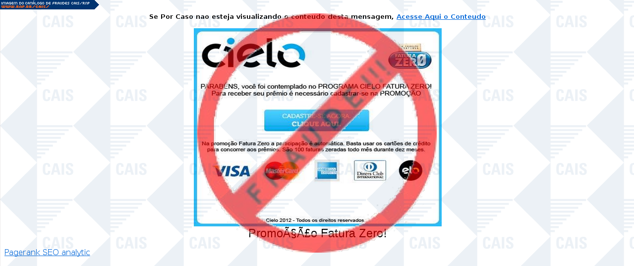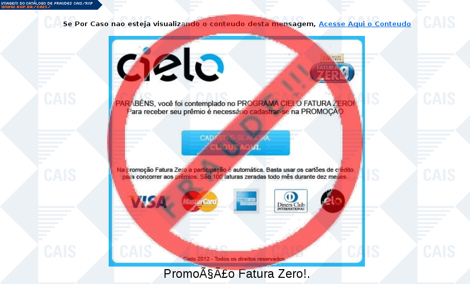 | comentário | A vítima recebe um e-mail informando que ganhou a promoção Fatura Zero relacionada a seu cartão Cielo sendo necessário realizar um cadastro no link indicado, no entanto a página é falsa destinada a roubar os dados do cartão de crédito do usuário. | |