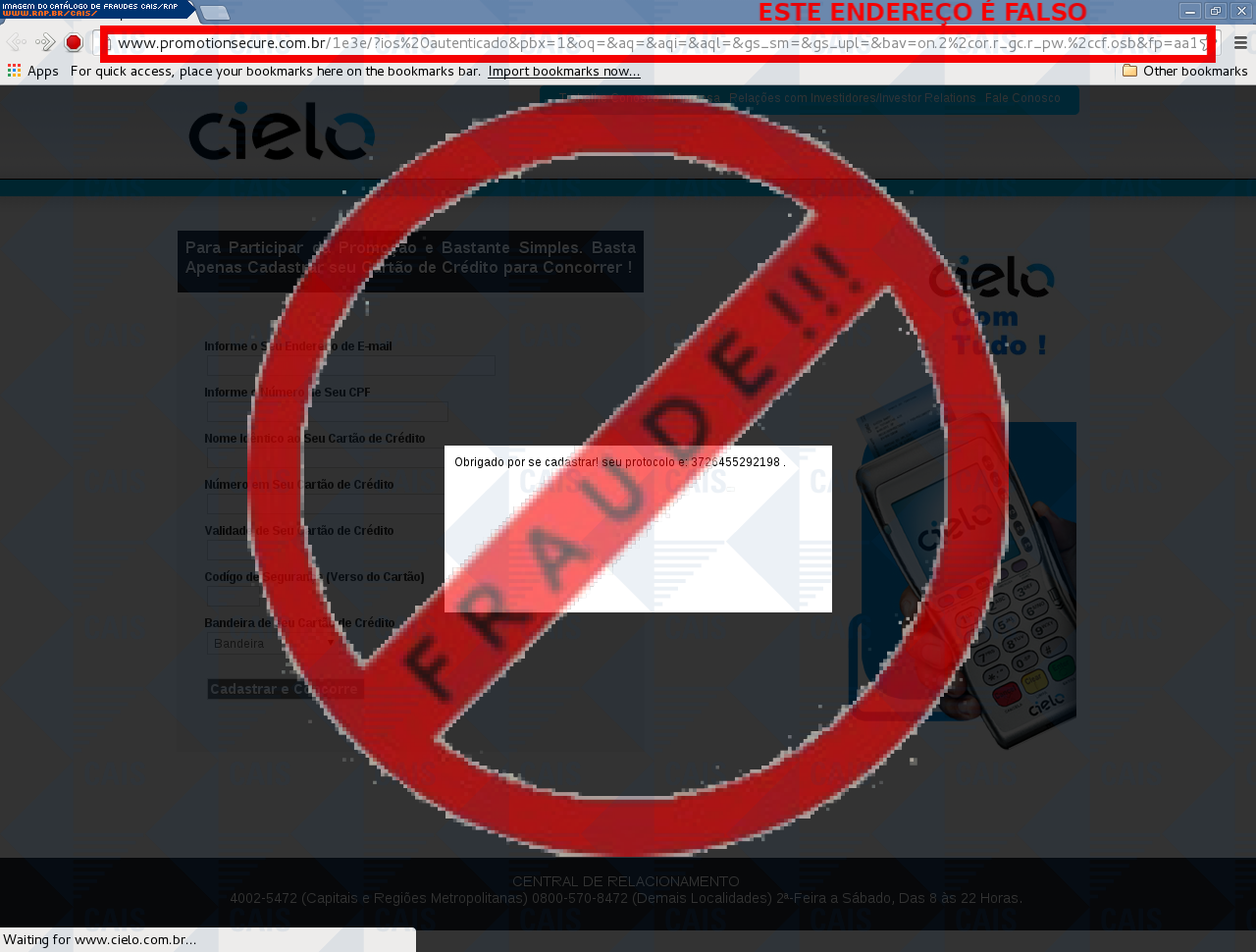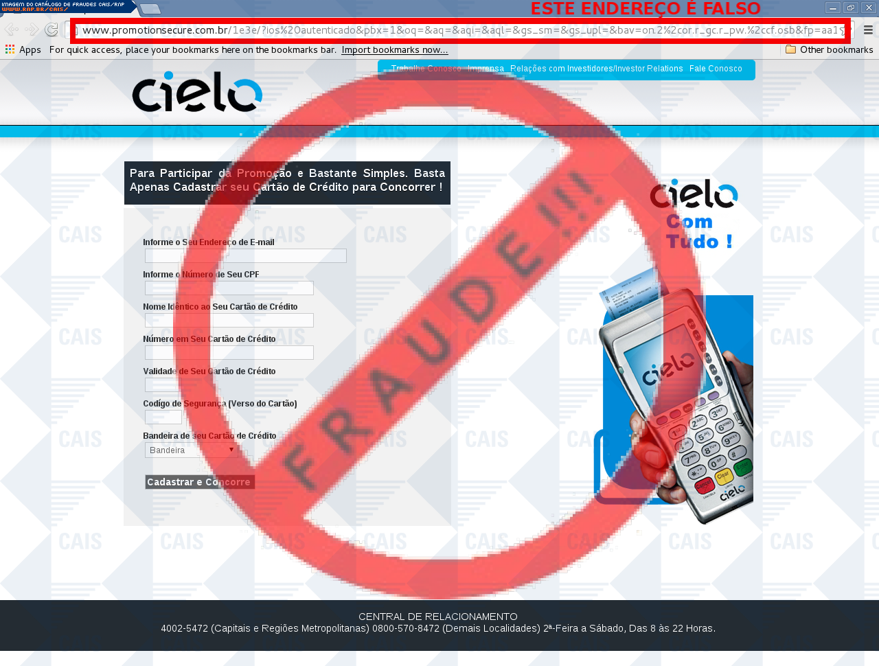 | comentário | A vítima recebe um e-mail informando sobre uma promoção relacionada a seu cartão Cielo sendo necessário realizar um cadastro, no entanto a página é falsa destinada a roubar os dados do cartão de crédito do usuário. | |