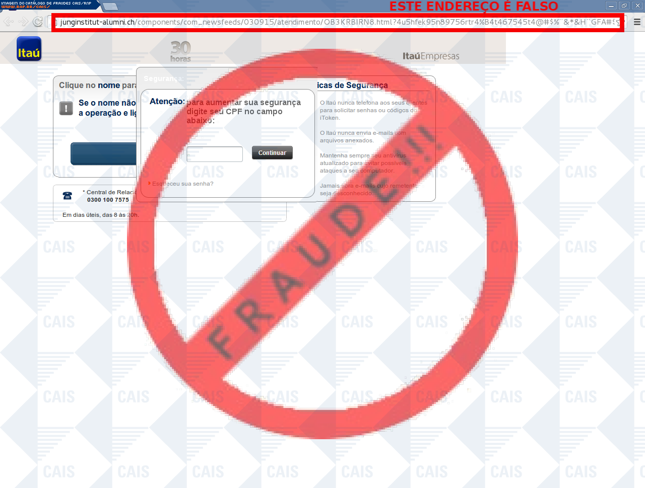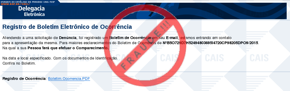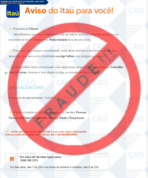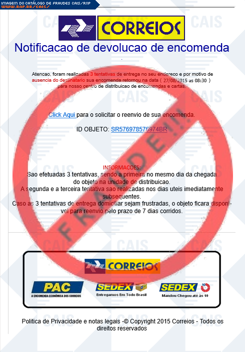 Esta página tem função informativa e educativa. Exibe uma coleção de imagens de phishing scam (fraudes eletrônicas) ou malware (código malicioso) veiculados por meio de spam (e-mail não-solicitado). Trata-se de conteúdo exemplificativo, não exaustivo, uma vez que não é possível contemplar todos os casos de fraudes existentes. Assim, caso você tenha conhecimento de um exemplar que não esteja aqui presente, isto não significa que não seja válido ou real. Inclusive incentivamos que você o envie para análise do CAIS para que, se for o caso, passe a integrar o nosso acervo.