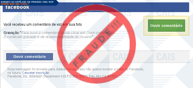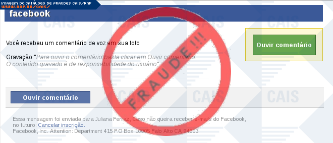 | comentário | O usuário recebe uma mensagem informando que há um comentário de voz em sua foto na rede social Facebook estando um link disponível para visualização, no entanto um arquivo malicioso é originado criado para roubar informações da vítima e instalar outros arquivos... (leia mais) | |