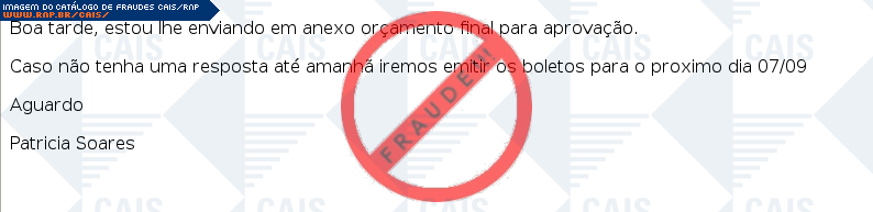| comentário | O usuário recebe uma mensagem contendo um orçamento disponível em anexo, no entanto o arquivo originado é malicioso criado para roubar informações da vítima e instalar outros arquivos fraudulentos com o nome de Trojan.VBS.UGJ. | |