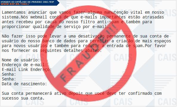 | comentário | O usuário recebe uma mensagem informando que sua conta de e-mail deverá passar por uma atualização sendo necessário responder o e-mail com algumas informações, no entanto o e-mail é falso criado para roubar os dados de login da vítima. | |