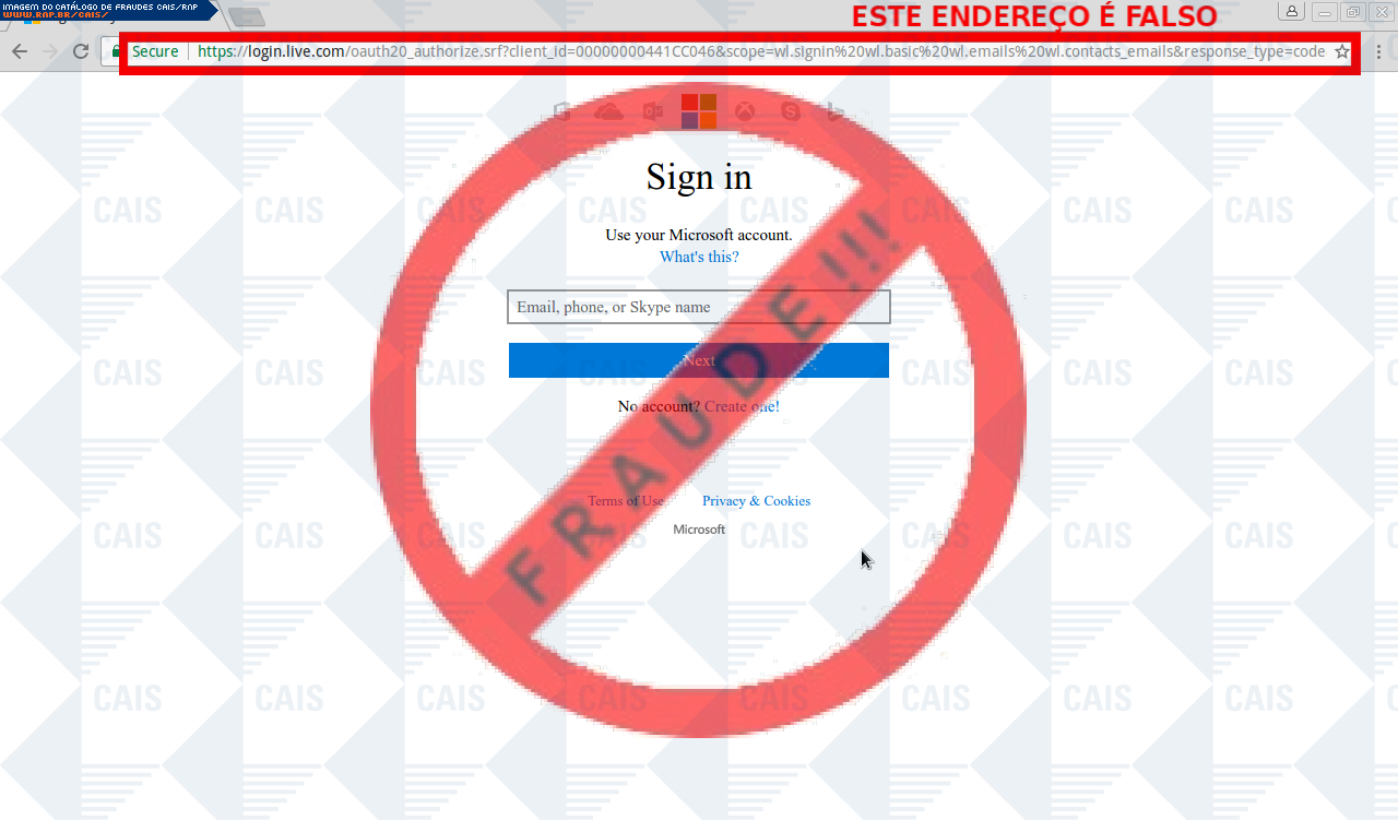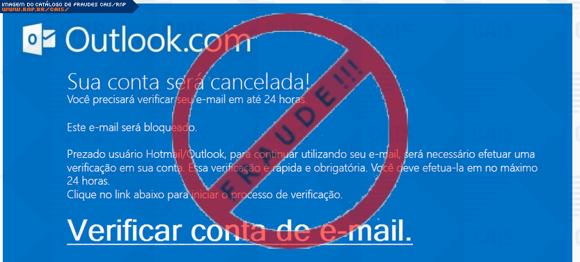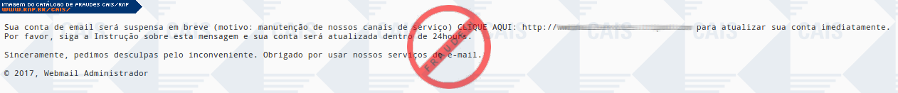 Esta página tem função informativa e educativa. Exibe uma coleção de imagens de phishing scam (fraudes eletrônicas) ou malware (código malicioso) veiculados por meio de spam (e-mail não-solicitado). Trata-se de conteúdo exemplificativo, não exaustivo, uma vez que não é possível contemplar todos os casos de fraudes existentes. Assim, caso você tenha conhecimento de um exemplar que não esteja aqui presente, isto não significa que não seja válido ou real. Inclusive incentivamos que você o envie para análise do CAIS para que, se for o caso, passe a integrar o nosso acervo.