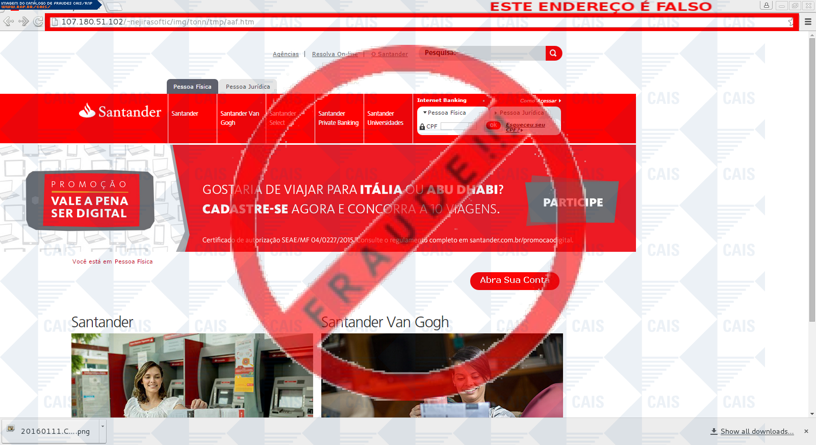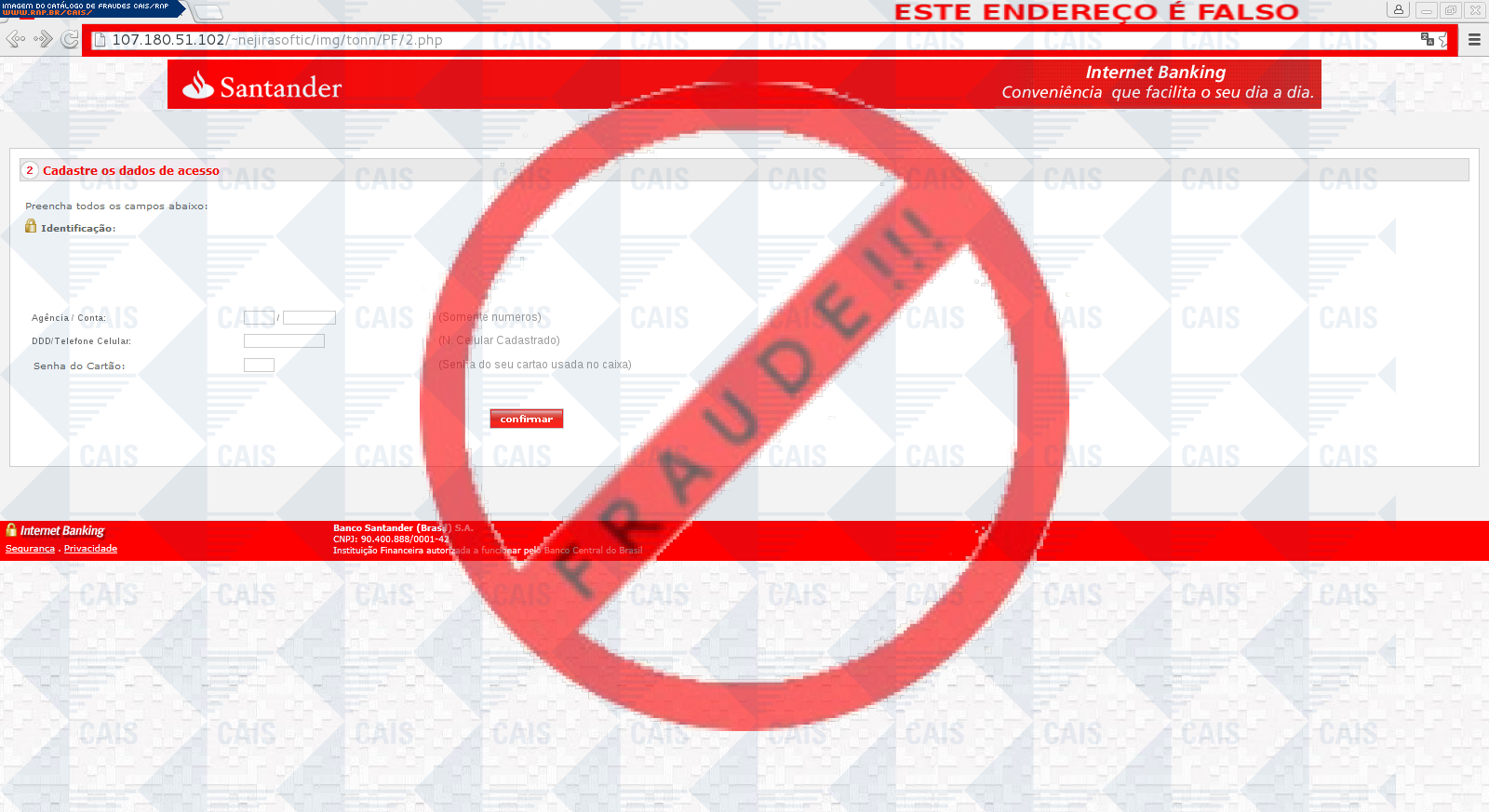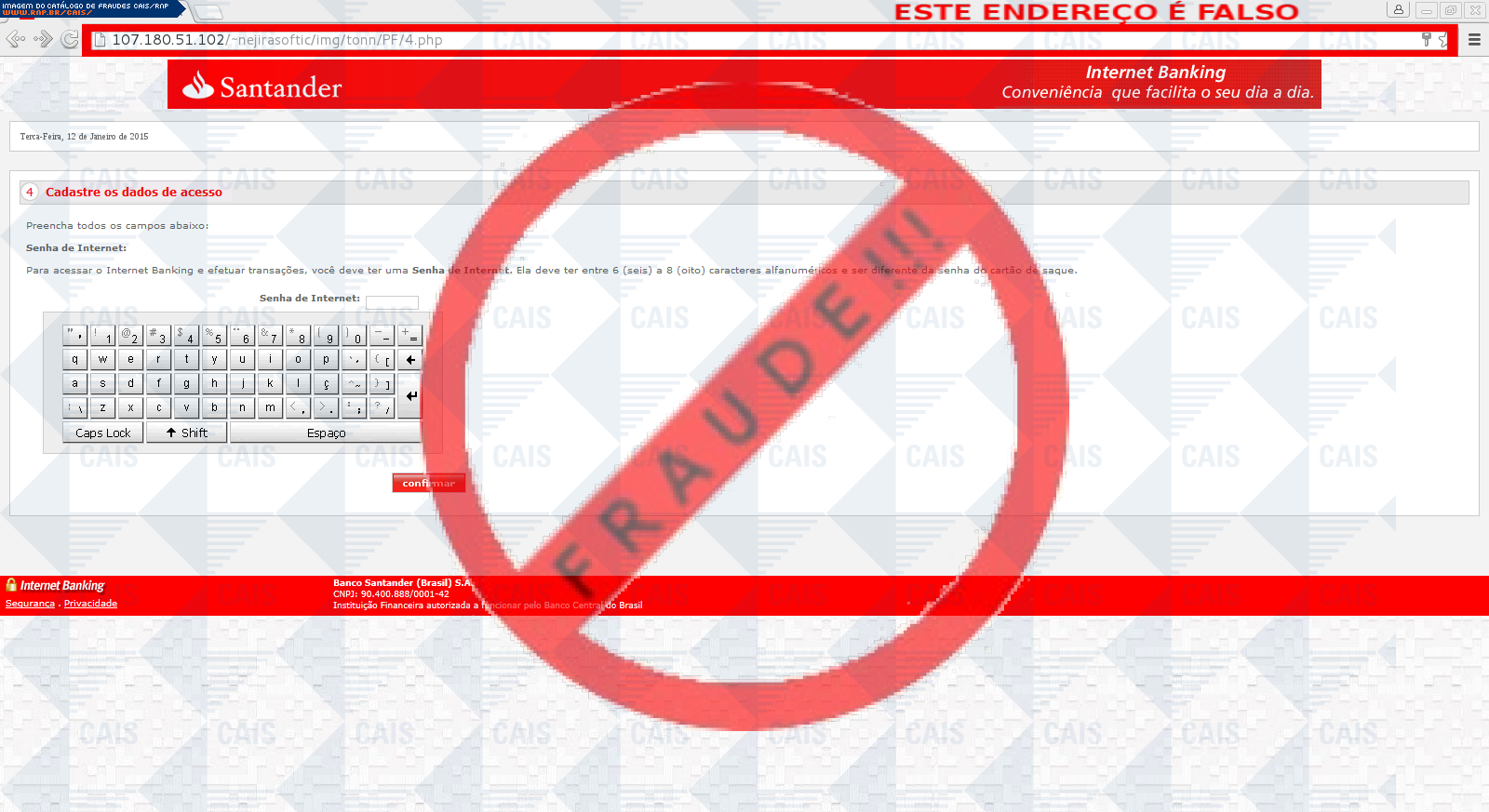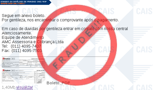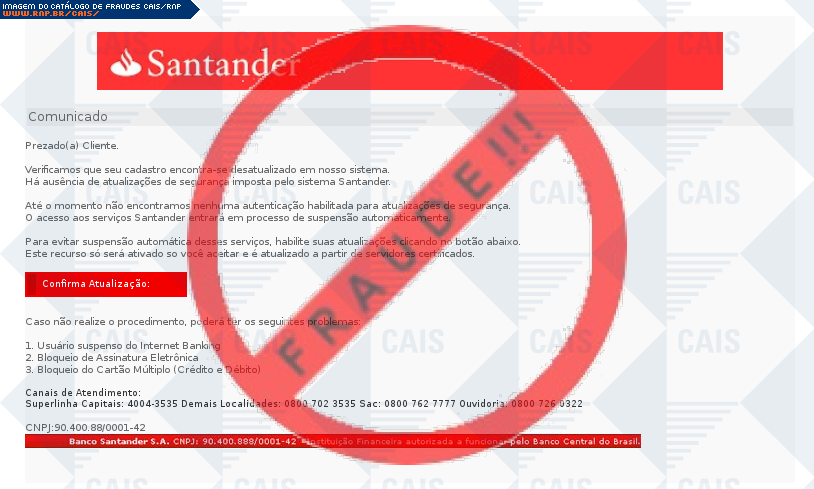 Esta página tem função informativa e educativa. Exibe uma coleção de imagens de phishing scam (fraudes eletrônicas) ou malware (código malicioso) veiculados por meio de spam (e-mail não-solicitado). Trata-se de conteúdo exemplificativo, não exaustivo, uma vez que não é possível contemplar todos os casos de fraudes existentes. Assim, caso você tenha conhecimento de um exemplar que não esteja aqui presente, isto não significa que não seja válido ou real. Inclusive incentivamos que você o envie para análise do CAIS para que, se for o caso, passe a integrar o nosso acervo.