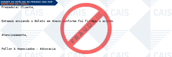 | comentário | A vítima recebe uma mensagem dizendo que há um a segunda via de uma fatura em anexo e que o atraso pagamento pode levar a problemas judiciais. Entretanto, o anexo leva ao download de um malware de nome MSIL/Banload.FQ!tr.dldr. | |