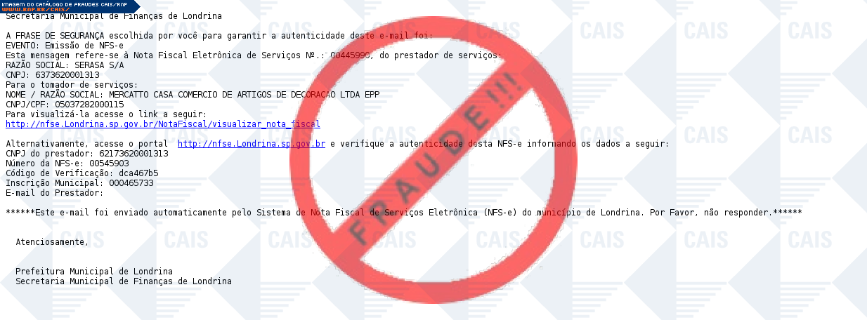 Com a disponibilização pública deste serviço, não é intenção do Centro de Atendimento a Incidentes de Segurança (CAIS) da Rede Nacional de Ensino e Pesquisa (RNP) violar direitos autorais sobre marcas registradas ou logotipos de empresas que porventura constem das amostras. O objetivo é tão somente alertar os usuários sobre as espécies de golpes que se utilizam de tais propriedades intelectuais ou industriais de forma criminosa.