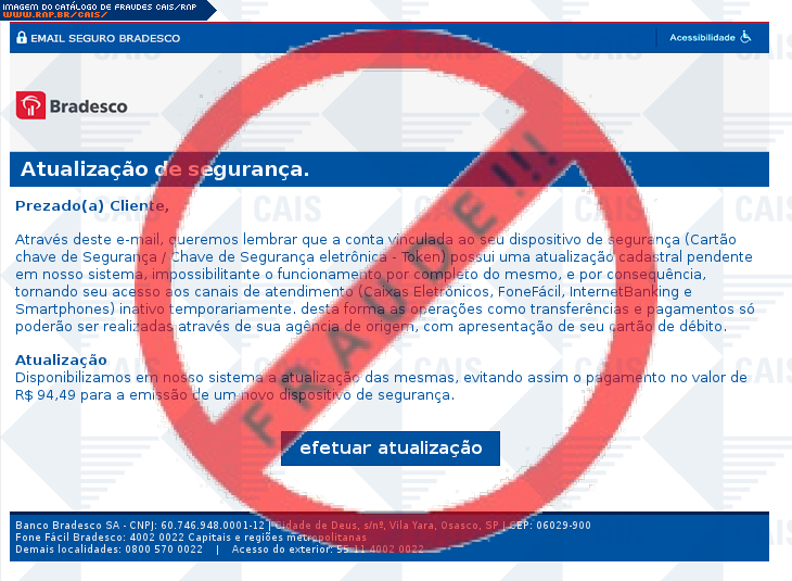 | comentário | O usuário recebe um e-mail informando que sua chave de segurança da conta do Banco Bradesco não está atualizada, estando a atualização disponível no link indicado, entretanto a página fornecida é falsa criada para roubar os dados bancários da vítima. | |