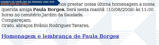 | comentário | Mensagem comunicando falcimento de suposta conhecida de nome Paula Borges. O texto fala ainda do horário do sepultamento. A fraude possui um link para suposta homenagem à falecida. Tal link na verdade leva a um software malicioso identificado como Gen:Trojan.Heur.qeZ@r9sy62gGi... (leia mais) | |