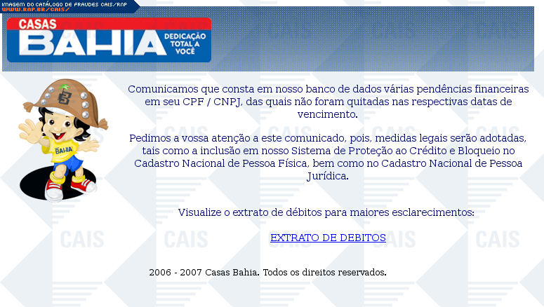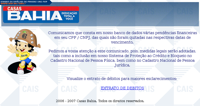 | comentário | Mensagem falsa se passando pela Casas Bahia informando débito pendente da vítima com a loja. Pelo português informal utlizado no assunto do email já é possível desconfiar da veracidade da mensagem. A fraude fornece um link através do qual seria possível ver... (leia mais) | |
