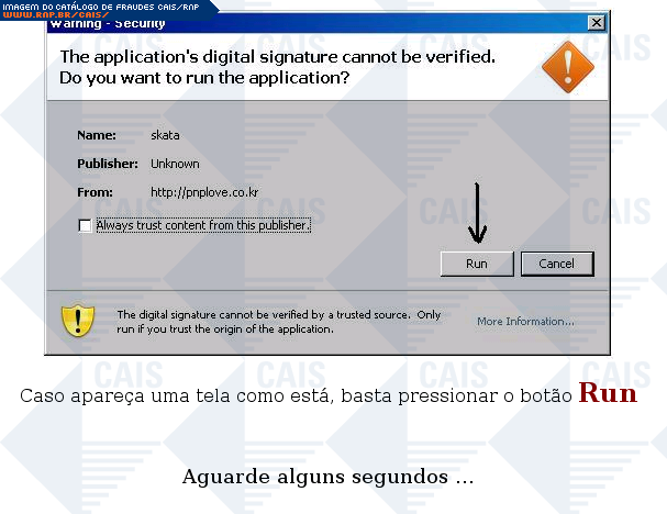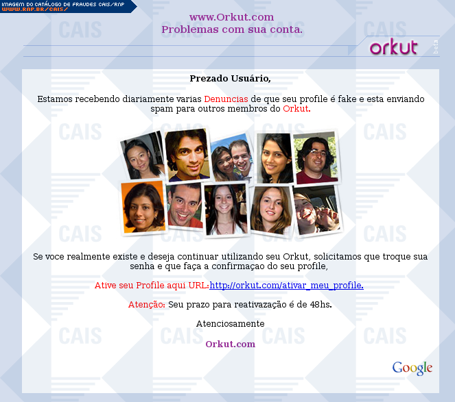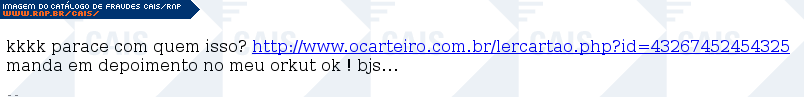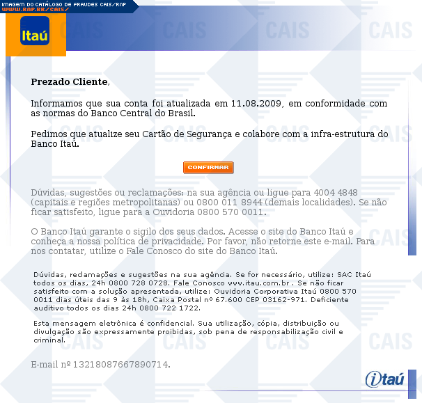 Esta página tem função informativa e educativa. Exibe uma coleção de imagens de phishing scam (fraudes eletrônicas) ou malware (código malicioso) veiculados por meio de spam (e-mail não-solicitado). Trata-se de conteúdo exemplificativo, não exaustivo, uma vez que não é possível contemplar todos os casos de fraudes existentes. Assim, caso você tenha conhecimento de um exemplar que não esteja aqui presente, isto não significa que não seja válido ou real. Inclusive incentivamos que você o envie para análise do CAIS para que, se for o caso, passe a integrar o nosso acervo.